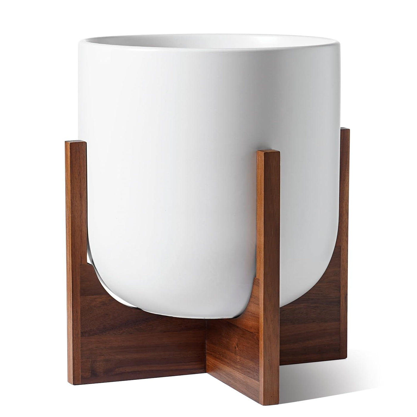 Le Tauci 12 Inch Pots For Plants With Acacia Wood Stand, Ceramic Large Planters For Indoor Plants, Indoor Plant Pots For Office
