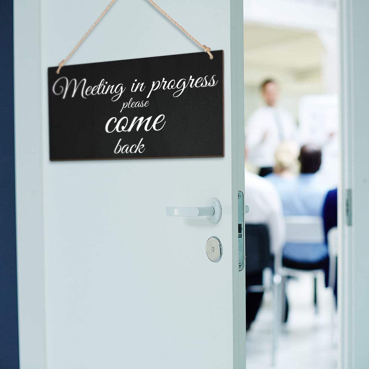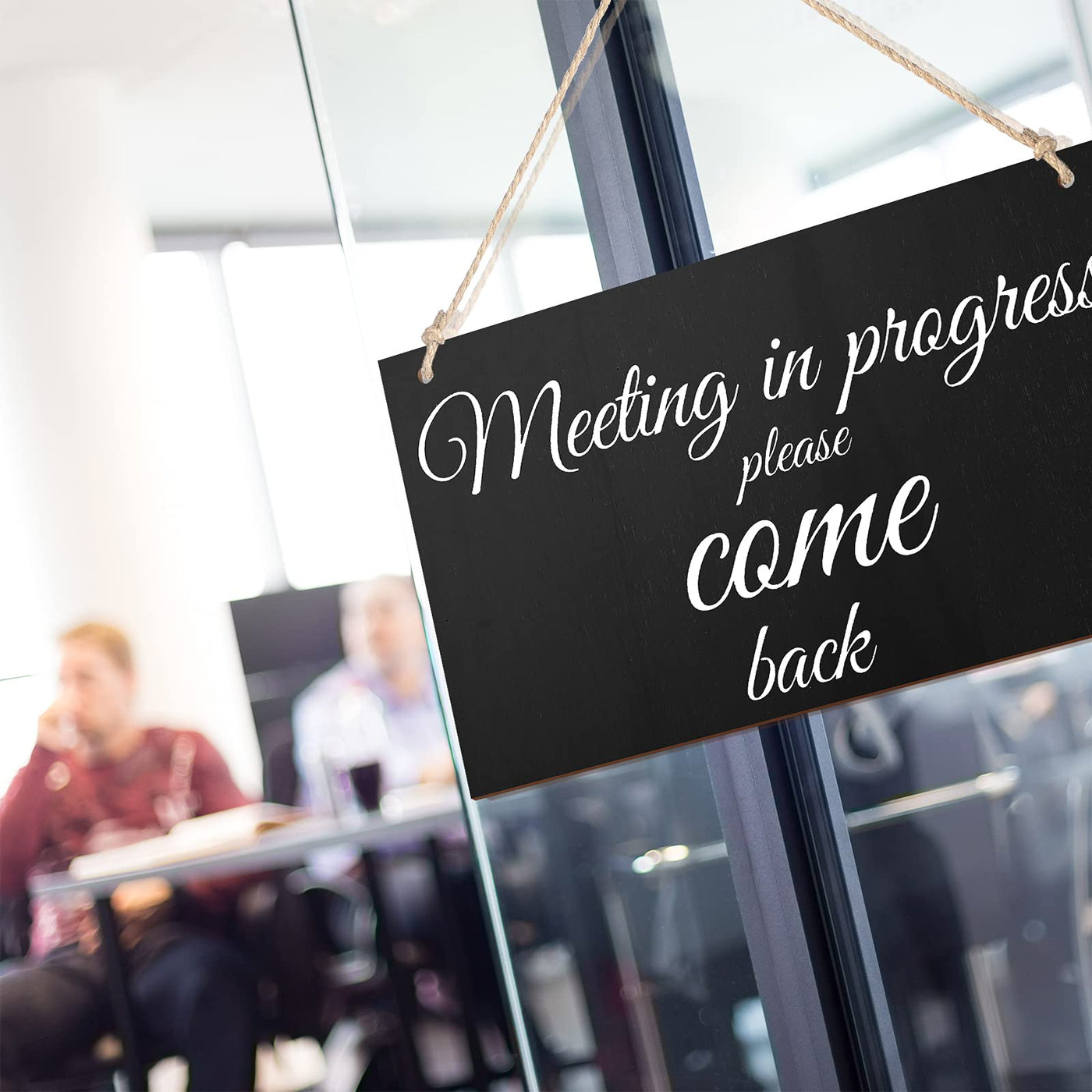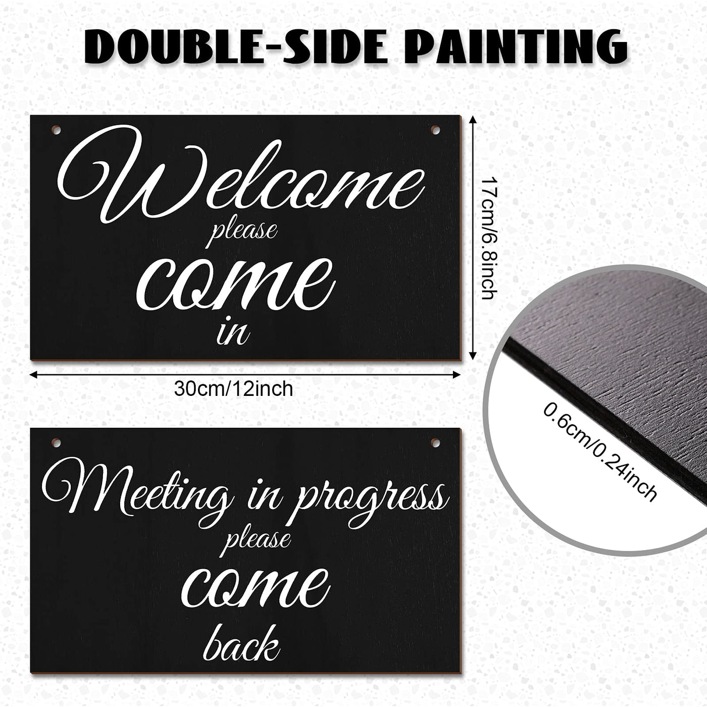Q: What does the sign say on both sides?A: The double-sided print features 'Welcome Please Come In' on one side and 'Meeting in Progress Please Come Back' on the other side, making it a versatile addition for your office or meeting room.