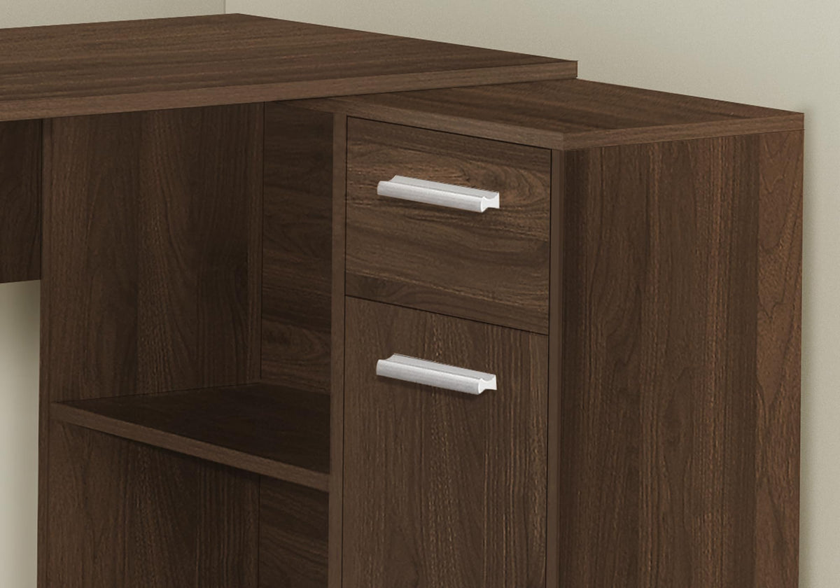 This corner computer desk with storage offers a practical and convenient solution for students and anyone with a small home office. The main worksurface measures 46 inches L x 21.5 inches W and easily accommodates a laptop or a monitor and keyboard. The desktop panel overlaps the storage unit on the right to create a second worksurface that is smaller and slightly lower. The storage unit provides multiple areas for keeping school supplies within easy reach. It includes 2 cubbies with 1 fixed shelf panel, 1 storage drawer, and 1 cabinet, both with finished interiors and silver handles. Finished in a dark walnut wood-look laminate, this L-shaped kids' desk is for use in a corner. If you prefer to position it elsewhere, it is finished on all sides for a polished look no matter where it is placed in a child's bedroom, dorm room, or home office. Additional dimensions: Space between leg and storage unit: 33.75 inches W 2 cubbies: 18 inches L x 11.5 inches W x 13.25 inches H each Storage drawer interior: 9.75 inches L x 8.5 inches W x 3 inches H Cabinet interior: 11.5 inches L x 11.5 inches W x 20.5 inches H