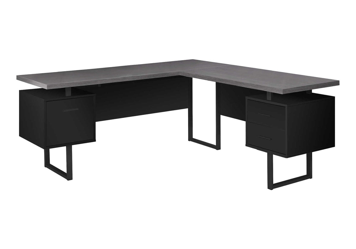 Sleek And Contemporary, This Extra-Long L Shaped Corner Computer Desk Is The Perfect Combination Of Function, Durability And Design In A Modern Form. Finished In A Chic Grey Wood Grain-Look Top With Black On All Sides, This Workstation With The Thick Floating Tops And Sleek U-Shaped Metal Legs Adds Pizzazz With Practicality To Any Home Office. Featuring Two Large Storage Drawers And A File Drawer To Help Keep You Organized, Which Can Conveniently Be Assembled On The Left Or Right Hand Side, With Plenty Of Desktop Surface For Your All Your Working Needs. This Highly Functional Desk Is A Must-Have For Any Home Business!