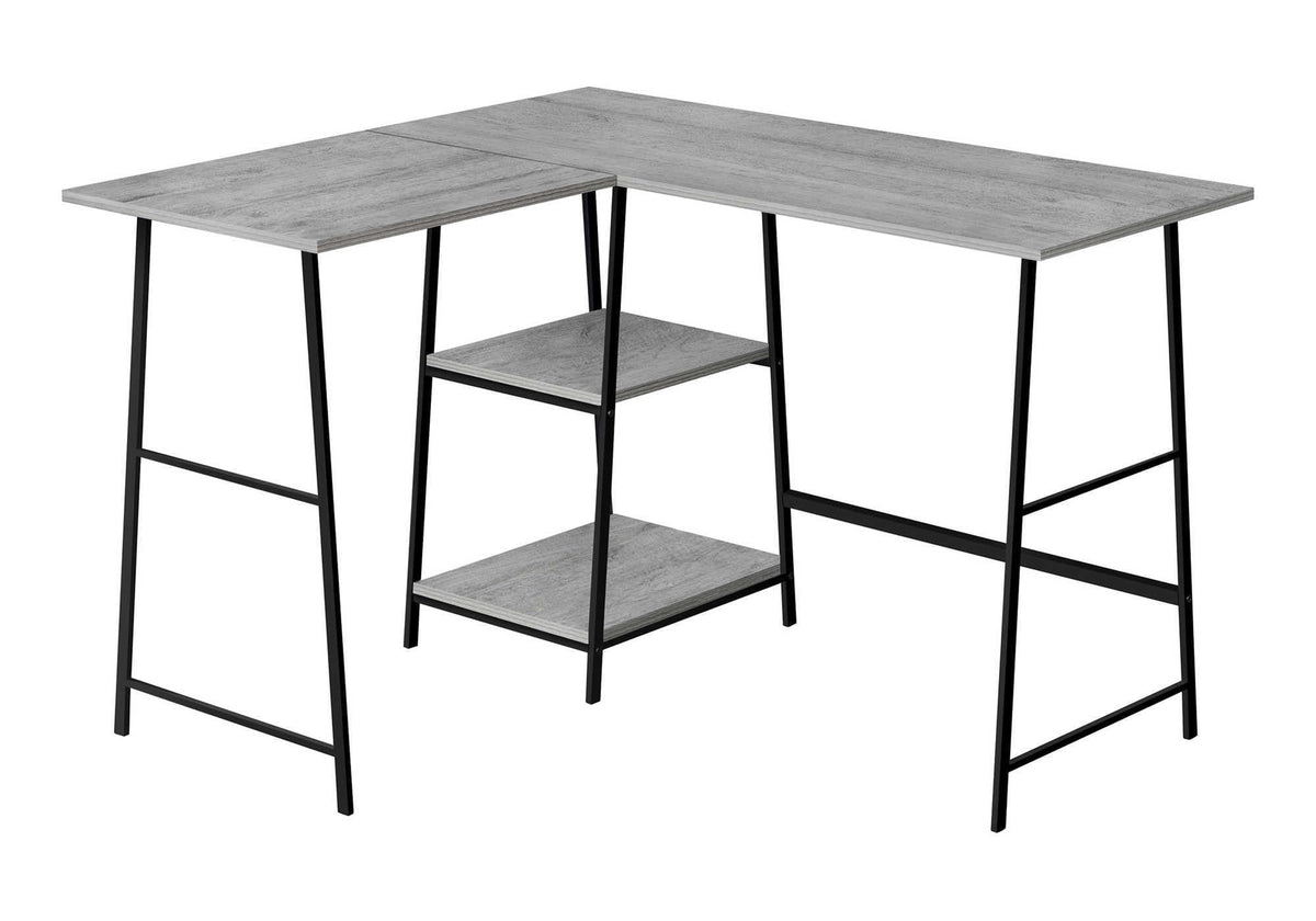 From top to bottom, this 3-tier Corner computer desk with shelves delivers practicality and style. The spacious desktop offers ample room for a laptop, lamp, and any essential items you need to be productive. To keep your workspace neat and organized, this writing table features sawhorse-style legs with 2 open and centered shelves for placing other supplies within reach underneath the desktop or for displaying decorative items. The desktops of this corner writing table are 48”L and 22”L respectively . The smooth, grey finish of the laminated panels matches the black finish of the metal legs for a clean, modern look. A great choice for home offices in need of a desk with storage, this L-shaped desk is finished on all sides for convenient placement anywhere in a room.