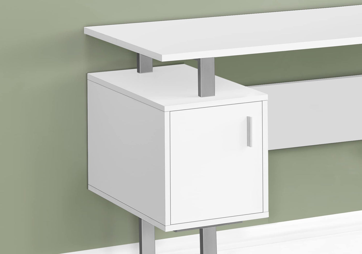 Be the boss with this sleek modern computer desk with 2 spacious storage cabinets to keep things organized and out of sight. This stylish mid-century inspired desk has a generous floating surface for your monitor or laptop and the bright white finish on all sides, including inside the cabinets, makes it versatile to setup anywhere in a room. Inside each cabinet is an adjustable shelf to neatly store your books and important documents. The silver metal u-shaped legs compliments and supports the entire desk giving it a contemporary appeal. There is plenty of room to comfortably place an office chair with 23.75 inches width between the two cabinets. This desk is both practical and perfect for small spaces blending well in a contemporary office space. Full assembly instructions are included.