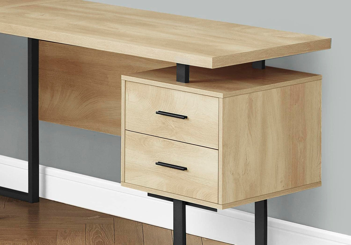If you've dreamt of having a corner office at work, this computer desk might be the next best thing. The extra-large, L-shaped desktop offers plenty of room for monitors, a lamp, and more. The 1.5-inch thick desktop has a special design that makes it appear as if it is floating and allows the tops of the 2 drawer units to be used as additional surfaces. For flexibility, the drawer units [one with 2 small drawers, the other with 1 large drawer for hanging files] are reversible and can be installed on either side according to your preference. Generous space between the drawer units offers room to easily move an office chair from one side of the desktop to the other. This stylish desk will bring a modern look to your home office. The drawer units and desktop are finished in a natural wood-look laminate that is contrasted by the black finish of the U-shaped metal legs. Additional dimensions: Interior of small drawers: 13.5 inches L x 15.25 inches W x 3 inches H Interior of large drawer: 13.5 inches L x 17.25 inches W x 10.5 inches H