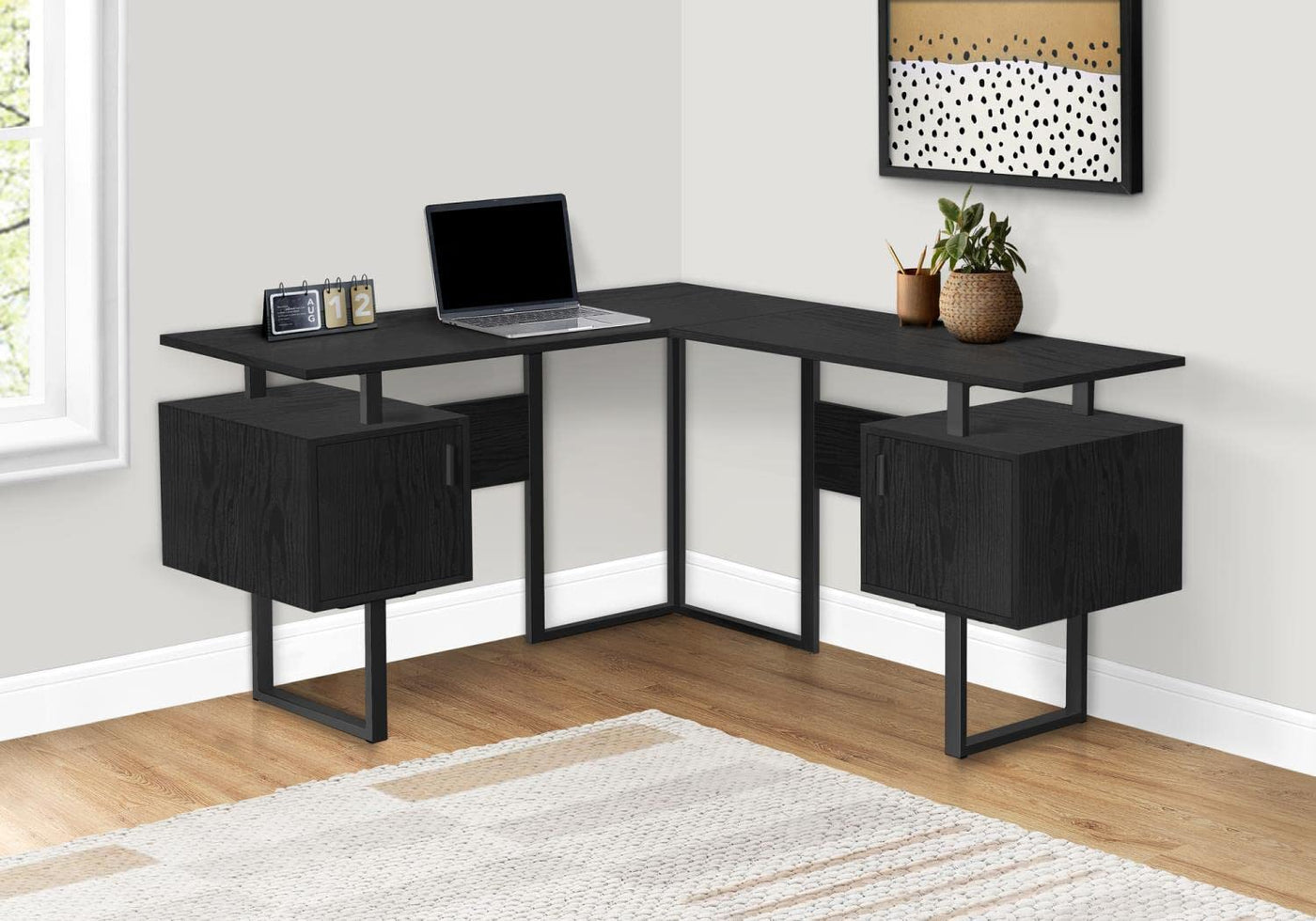 Give your corner office space some substance with this sleek and modern, L-shaped reversible computer desk in an updated mid-century style. The bold black oak-look finish on all sides gives greater versatility to place anywhere in a room. The 2 storage cabinets at each end of the desk are accented with simple black metal handles and installed with an adjustable shelf to conveniently place paperwork, books, and other office essentials within reach. The floating desktop has plenty of space to spread out your work, place some office supplies, house a computer monitor or laptop, basically everything you need to create an efficient work area. This desk is also reversible, allowing you to setup the long and short side either on the left or right, all supported with strong metal u-shaped black legs to give it a floating appearance. Full illustrated step by step assembly instructions are included.