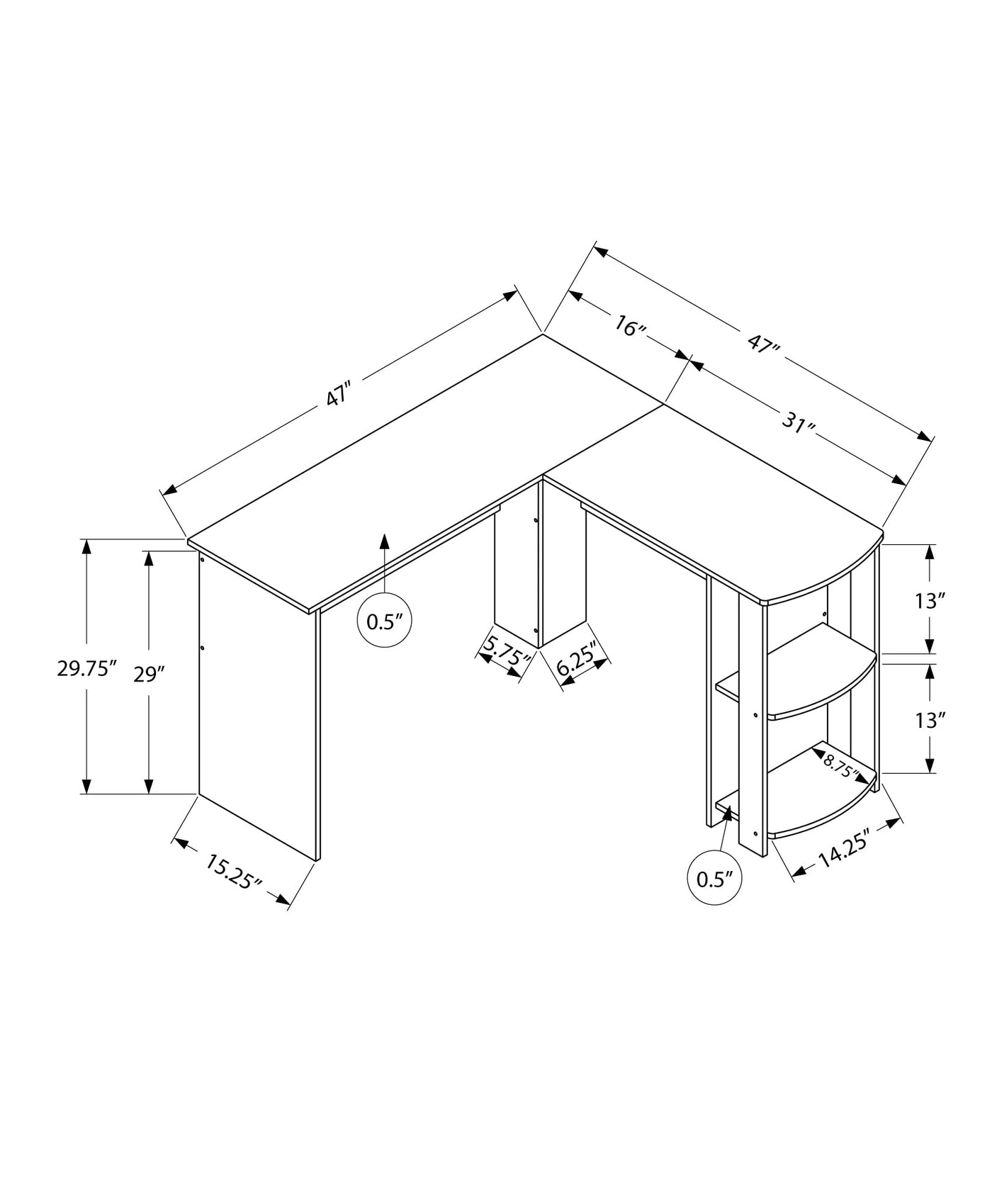 This corner computer desk with storage offers a practical and convenient solution for students and anyone with a small home office. The main worksurface measures 47 inches x 47 inches in length and easily accommodates a laptop or a monitor and keyboard. The desktop panel overlaps the two open storage shelves. The storage unit provides multiple areas for keeping school supplies within easy reach. It includes 2 cubbies with 1 fixed shelf panel. Finished in a wood-look laminate, this L-shaped kids' desk is for use in a corner. If you prefer to position it elsewhere, it is finished on all sides for a polished look no matter where it is placed in a child's bedroom, dorm room, or home office.