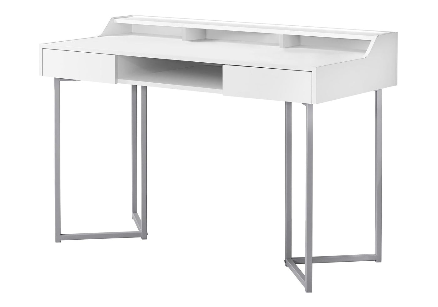 This Modern Style Computer Desk Packs A Lot Of Storage Options In One Sleek Compact Design. The Spacious Table Top, Made From Durable Mdf Material, Is Finished In A Chic White On All Sides With Ample Room For A Laptop, Lamp, Office Supplies Along With Three Open Cubbies And A Top Shelf For Your Easy To Reach Essentials. There Are Two Seamless Storage Drawers With A Push-In Mechanism And An Open Concept Shelf In The Middle To Store A Tablet, Books, Or Magazines. The Desk Finishes Off With Bold Angular Silver Metal Legs For A Light Contemporary Feel. Place This Space Saving Desk In Any Room For Instant Style With Maximum Functionality! Assembly Is Required.