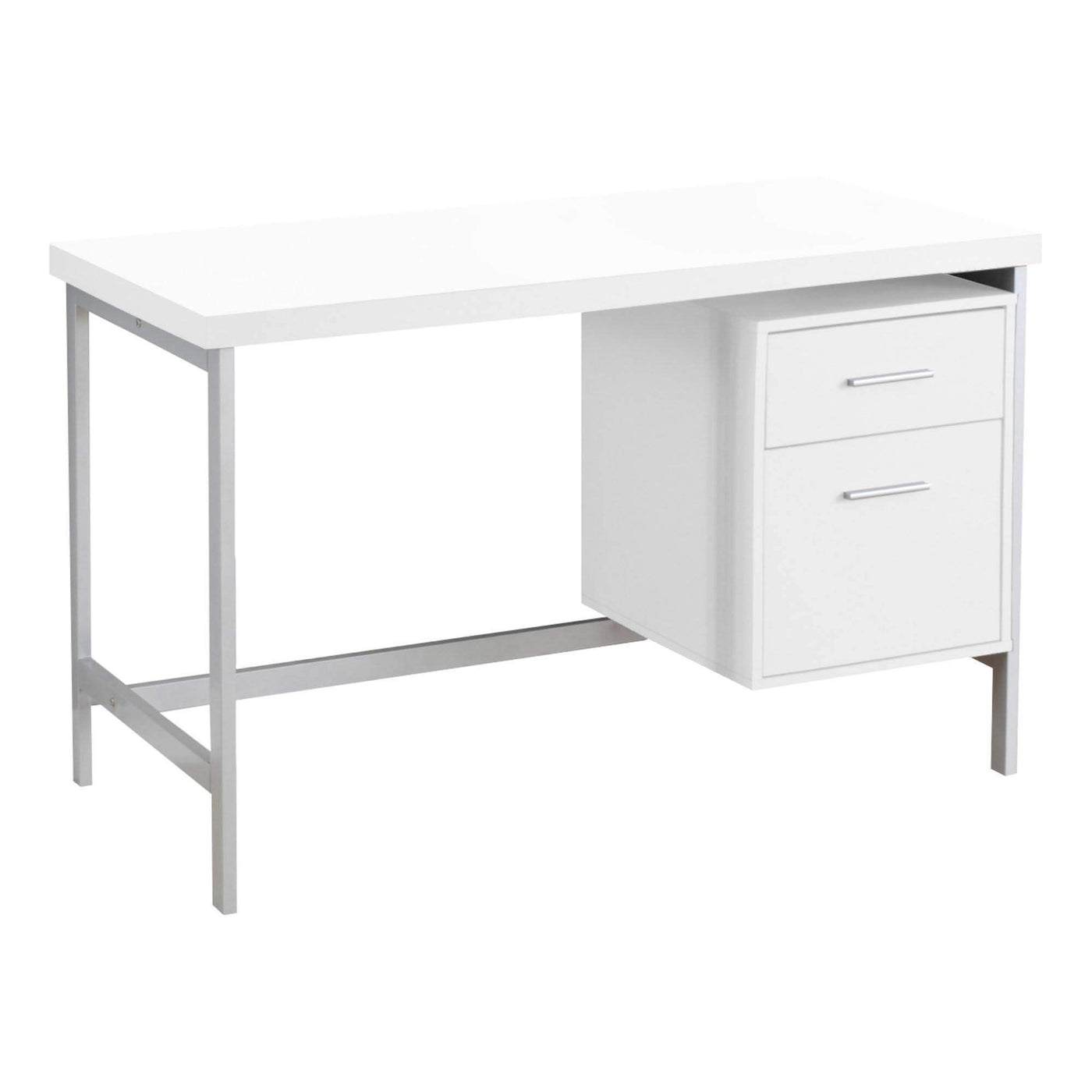Sleek And Contemporary, This White Finished Desk Is The Perfect Combination Of Function, Durability And Design In A Modern Form. With Clean Lines, A Large, Thick Paneled Surface And Stylish Silver Metal Legs, This Piece Will Add Pizzazz To Any Home Office. Featuring A Large Storage Drawer And A File Drawer Accented By Silver Colored Drawer Pulls To Help Keep Your Office Supplies And Documents Organized And Desktop Clutter Free. This Desk Provides Plenty Of Room To Meet Your Working Needs Without Compromising Style Making This A Must Have In Any Home Office.