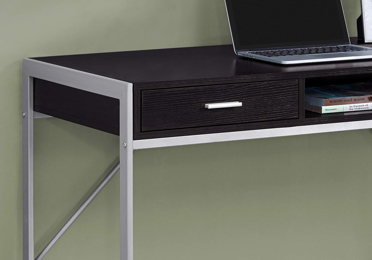 Combining function and style, This contemporary computer desk will be an instant standout in your home office. The spacious desktop with a warm Cappuccino finish on all sides with silver accents, Includes two drawers to store away notepads, books, office supplies and an open concept Middle shelf for papers will keep you neatly organized. Strong, square silver metal legs and frame support The desk for a chic modern statement. The space-saving design is an added bonus that can easily hold your laptop, a lamp, a picture or plant to round out your personal office space. Assembly is required.