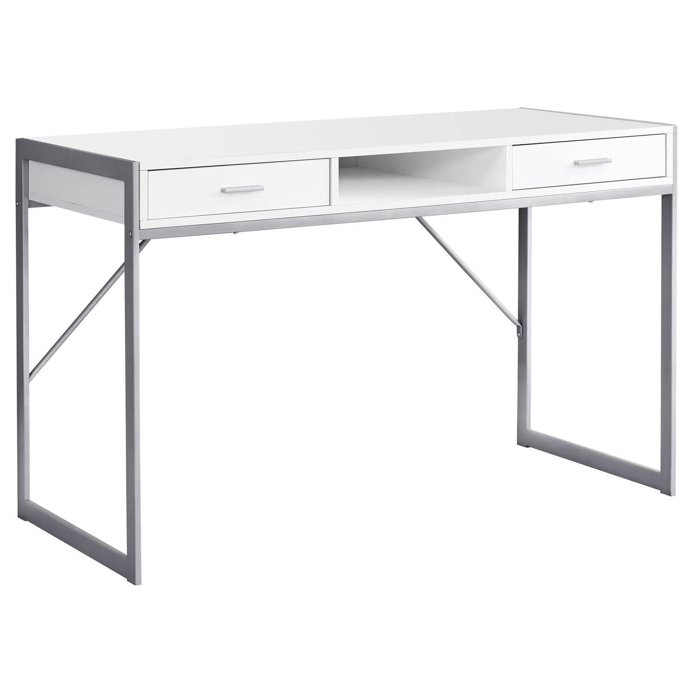 Combining function and style, This contemporary computer desk will be an instant standout in your home office. The spacious desktop with a sleek White finish on all sides with silver accents, Includes two drawers to store away notepads, books, office supplies and an open concept Middle shelf for papers will keep you neatly organized. Strong, square silver metal legs and frame support The desk for a chic modern statement. The space-saving design is an added bonus that can easily hold your laptop, a lamp, a picture or plant to round out your personal office space. Assembly is required.