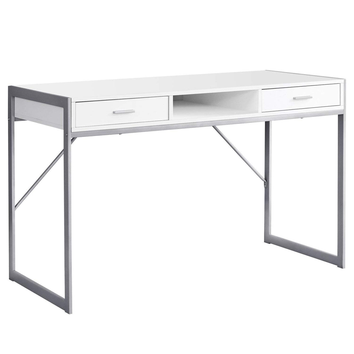 Combining Function And Style, This Contemporary Computer Desk Will Be An Instant Standout In Your Home Office. The Spacious Desktop With A Sleek White Finish On All Sides With Silver Accents, Includes Two Drawers To Store Away Notepads, Books, Office Supplies And An Open Concept Middle Shelf For Papers Will Keep You Neatly Organized. Strong, Square Silver Metal Legs And Frame Support The Desk For A Chic Modern Statement. The Space-Saving Design Is An Added Bonus That Can Easily Hold Your Laptop, A Lamp, A Picture Or Plant To Round Out Your Personal Office Space. Assembly Is Required.