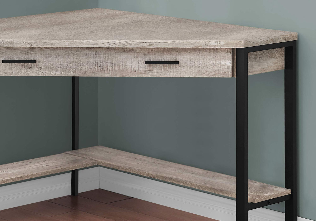 That unused corner in your home just got filled with this perfectly angled, contemporary style, Corner computer desk. The black metal framing elevates the whole design into a stylish and practical workspace. This desk provides plenty of storage options, with a single long drawer accented with sleek black plastic handles, and open Bottom shelving for books and other office essentials within easy reach. Finished in a warm taupe reclaimed wood-look on all sides Also allows You to bring it to the center of the room for ALL to admire. This unique style Corner desk has everything you need to create your personal home office setup. Assembly is required.
