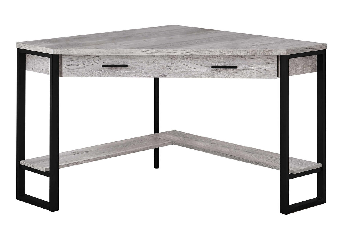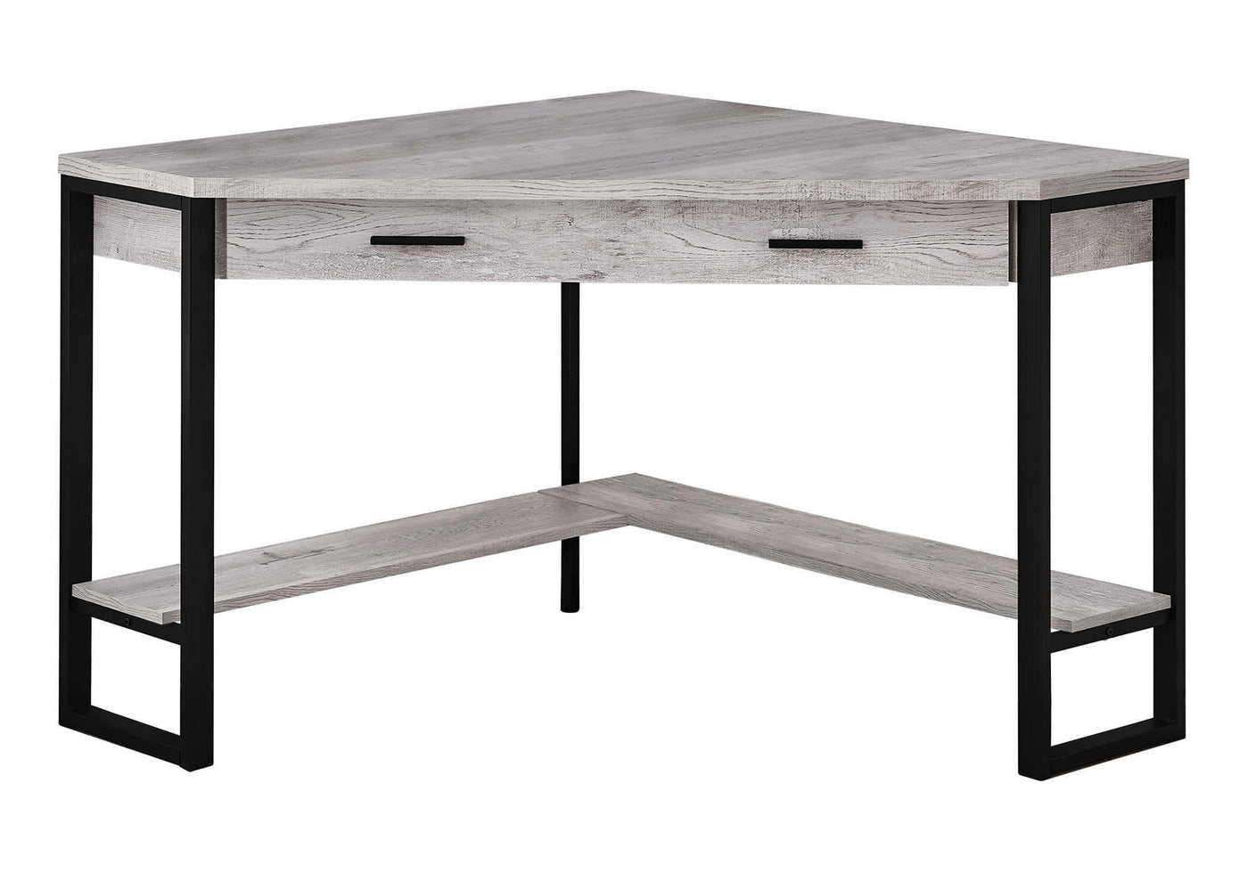 That Unused Corner In Your Home Just Got Filled With This Perfectly Angled, Contemporary Style, Corner Computer Desk. The Black Metal Framing Elevates The Whole Design Into A Stylish And Practical Workspace. This Desk Provides Plenty Of Storage Options, With A Single Long Drawer Accented With Sleek Black Plastic Handles, And Open Bottom Shelving For Books And Other Office Essentials Within Easy Reach. Finished In An Elegant Grey Reclaimed Wood-Look On All Sides Also Allows You To Bring It To The Center Of The Room For All To Admire. This Unique Style Corner Desk Has Everything You Need To Create Your Personal Home Office Setup. Assembly Is Required.