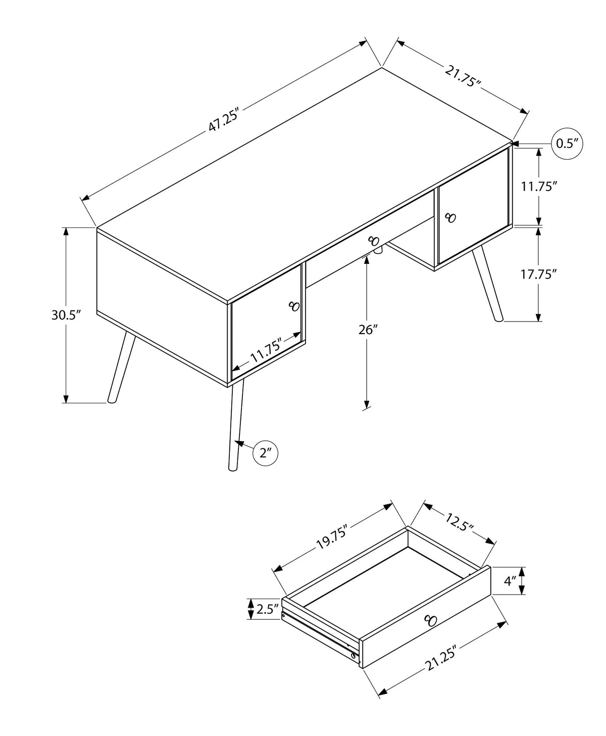 This exquisite computer desk with storage delivers excellent functionality without sacrificing style. The desktop offers room for the essentials you need to be productive. Underneath are 1 storage drawer and 2 cabinets that provide storage space for writing materials and office supplies. The front of the storage drawer has a distinctive, rippled pattern that adds an interesting texture and visual effect. Brushed metal drawer knobs in a gold finish and gold detailing on the legs bring an element of sophisticated glam. The walnut wood-look laminate finish has realistic color variations, while the round solid wood legs are sturdy and sleek. With its trendy, mid-century modern style, this laptop table is a great choice if you are looking for a desk that offers storage options and has a retro yet contemporary appeal. It's also versatile and stylish enough to serve as an accent table, which is desirable if you use your living room or bedroom as a home office. Additional dimensions: Drawer interior: 19.75 inches L x 12.5 inches W x 2.5 inches H Cabinet interiors: 11.75 inches L x 21.75 inches W x 11.75 inches H each Space from floor to underside of drawer: 26 inches H