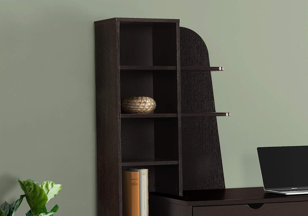 Here Is A Stylish And Practical All-In-One Solution To Build Your Home Office Or Study Center! This Modern, Retro-Inspired Computer Desk With An Attached Bookcase On The Side (Not Reversible), Has Multiple Storage Options For Your Daily Work Needs. The Smooth And Spacious Rectangular Desk Surface Has Plenty Of Room For Your Laptop, A Lamp, And Office Supplies Along With 2 Large Storage Drawers To Tuck Away Writing Materials. The 7 Fixed Open Shelves Come In A Variety Of Sizes As An Easily Accessible Storage Unit. The Whole Workstation Is Supported With Thick, Solid Wood Angled Legs And Finished In A Rich Wood-Look Dark Brown Espresso On The Front And Sides. Assembly Is Required.