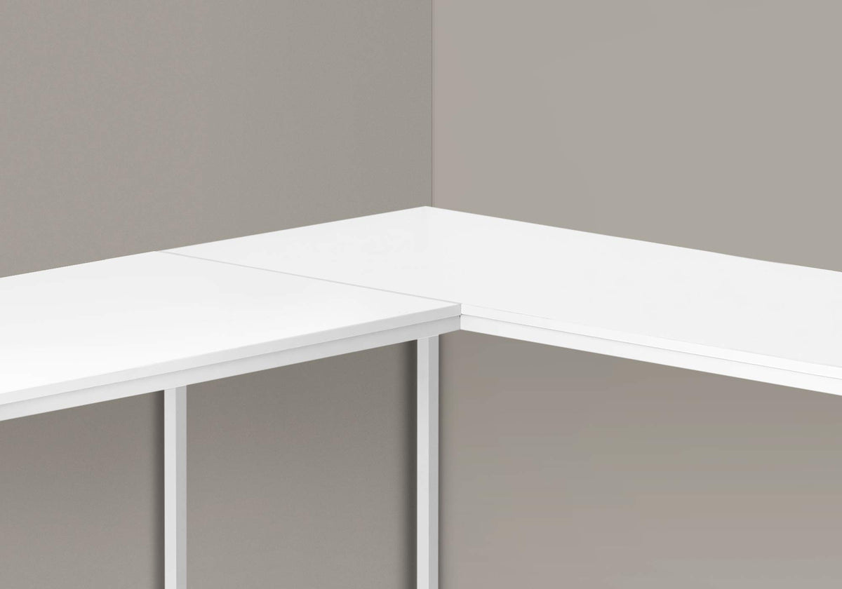 You won't feel boxed into a corner with this spacious L-shaped corner desk that offers a large work surface in a compact design. Set up your computer monitor or laptop on the left or right side of the desktop based on your preference, then arrange the other items you need to maximize your productivity. There's more than enough space for a desk lamp, file organizer, and pencil holder, as well as for decorative items, like picture frames or special keepsakes. Moving around to reach your supplies is easy thanks to the open space underneath the desk that offers generous leg room. Leave this area empty or use it to place a computer tower or file boxes with important papers. With its L shape, this computer desk is ideally placed in the corner of a room. If you prefer to position it elsewhere, it is finished on all sides for a polished look no matter where it is placed in your home office. Desktop panels in a white laminate and a metal base also in a white finish give this corner desk a sleek style that will bring a touch of modern simplicity to any room.