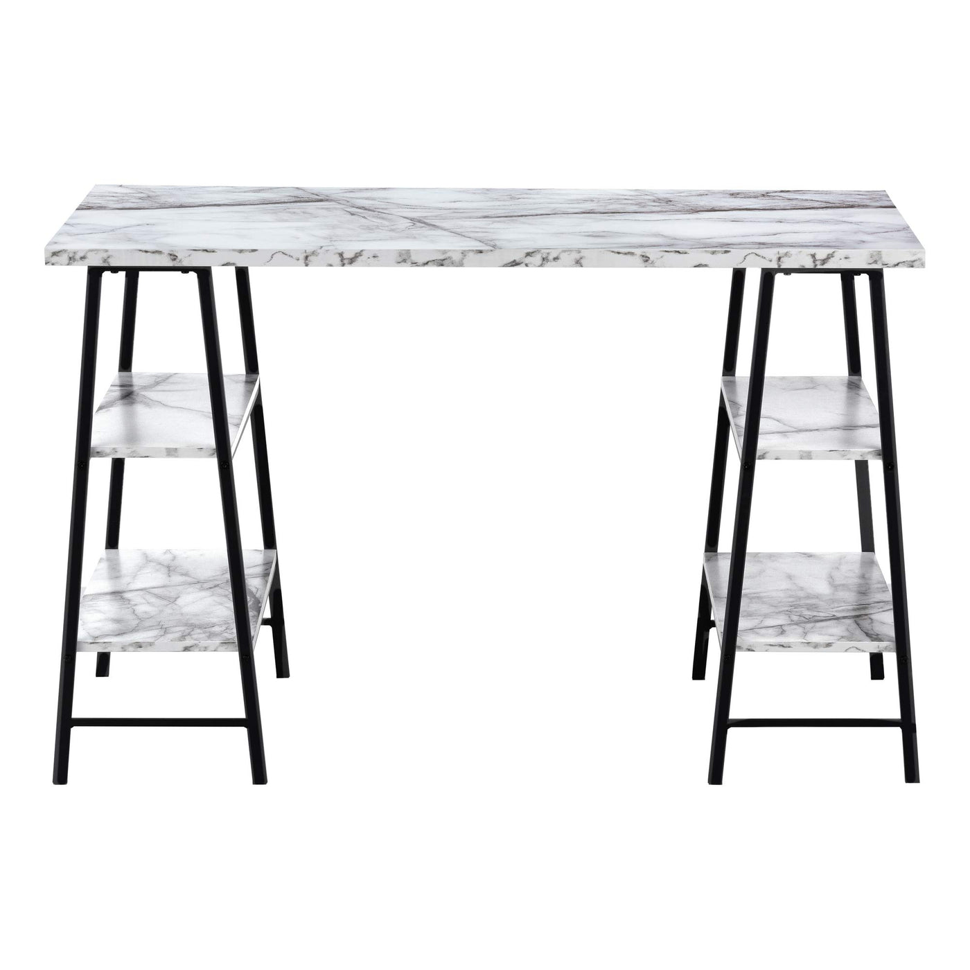 From Top To Bottom, This 3-Tier Computer Desk With Shelves Delivers Practicality And Style. The Spacious Desktop Offers Ample Room For A Laptop, Lamp, And Any Essential Items You Need To Be Productive. To Keep Your Workspace Neat And Organized, This Writing Table Features Sawhorse-Style Legs With 4 Shelves (2 On Each Side) For Placing Other Supplies Within Reach Underneath The Desktop Or For Displaying Decorative Items. The 2 Upper Shelves Measure 8.5 Inches L X 21.5 Inches W X 10.25 Inches H Each, While The 2 Bottom Shelves Are Slightly Larger, Measuring 10.5 Inches L X 21.5 Inches W X 9.75 Inches H Each. The White Marble-Look Finish Of The Laminated Panels Provides An Interesting Visual Contrast Against The Black Finish Of The Metal Legs For An On-Trend, Modern Industrial Look. A Great Choice For Smaller Home Offices In Need Of A Desk With Storage, This Compact Desk Is Finished On All Sides For Convenient Placement Anywhere In A Room.