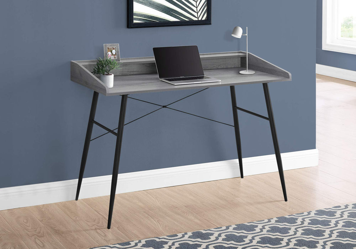 This Computer Desk With Hutch In A Grey Wood-Look Finish Will Take Your Home Office To The Next Level. The Sides Of The Desktop Gradually Rise To Meet The Hutch For A Sleek Look. The Top Of The Hutch Doubles As A Shelf, While The Space Underneath Is Divided Into 2 Storage Cubbies Where You Can Tuck Away Small Items And Keep Your Work Surface Organized. Providing Support And Stability Is A Metal Base In A Black Finish And Featuring Striking Design Details, Like Tapered Metal Legs And Slender X-Shaped Support Bars. This Laptop Or Writing Table Has A Compact Design And Mid-Century Modern Style That Is A Great Choice If You Use Your Living Room Or Bedroom As A Home Office. Computer Desk In A Grey Wood-Look Finish Featuring A Small Hutch With A Long Shelf And 2 Storage Cubbies. Metal Base In A Contrasting Black Finish Features Tapered, Angled Metal Legs And X-Shaped Support Bars On Back That Provides Stability.