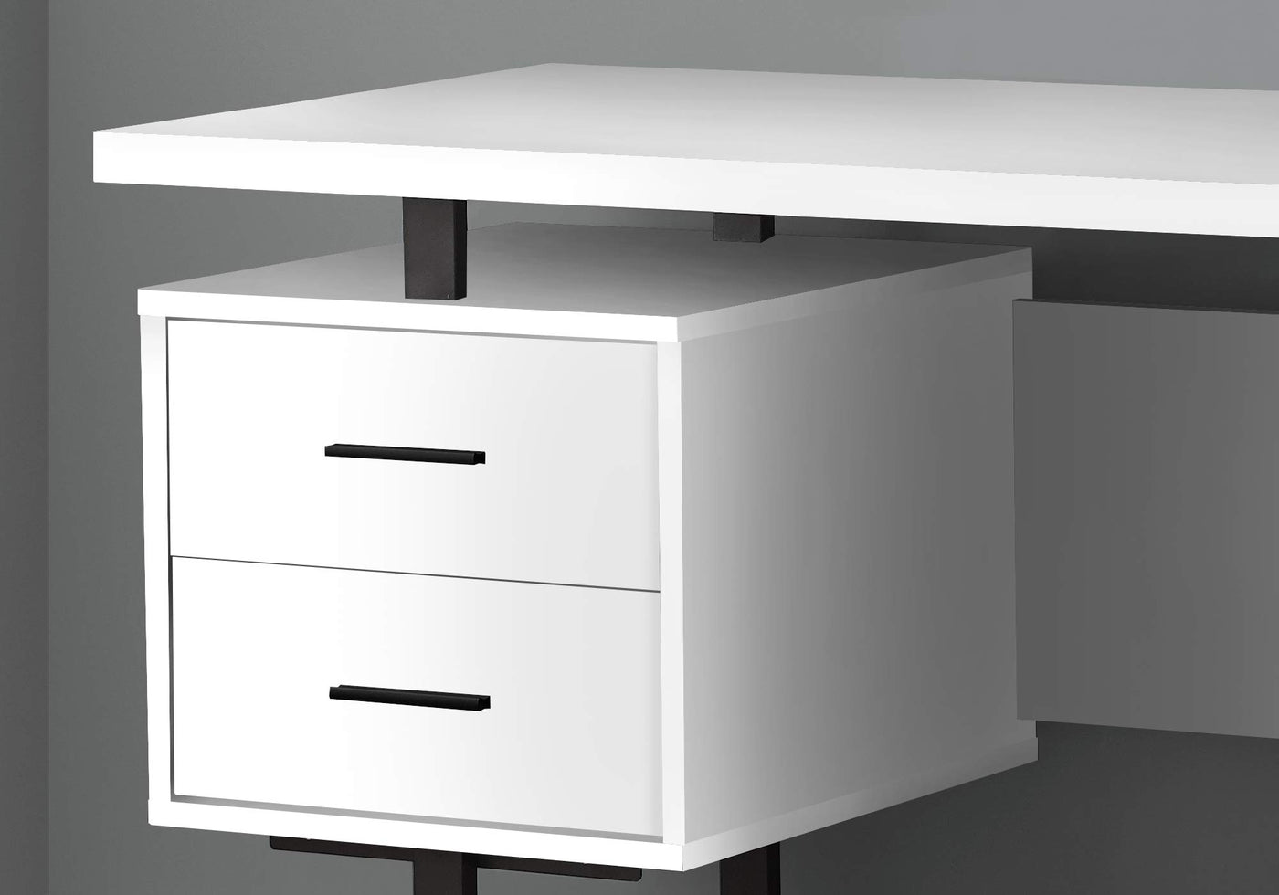Get Down To Business At Home With This Mid-Size Computer Desk. The Large Desktop Easily Accommodates A Laptop, Writing Materials, And More. The 1.5-Inch Thick Desktop Panel Has A Special Design That Makes It Appear As If It Is Floating And Allows The Tops Of The 2 Drawer Units To Be Used As Additional Surfaces. The 3 Storage Drawers (2 Small Drawers And 1 Large Drawer With A Hanging File Bar) Offer Space For Items You Want To Keep Off The Desktop. For Flexibility, The Drawer Units Are Reversible And Can Be Installed On Either Side According To Your Preference. This Stylish Desk Will Bring A Modern Look To Your Home Office. The Drawer Units And Desktop Are Finished In A White Laminate That Is Contrasted By The Black Finish Of The U-Shaped Metal Legs. Additional Dimensions: Interior Of Small Drawers: 13.5 Inches L X 15.25 Inches W X 3.25 Inches H Interior Of Large Drawer: 13.5 Inches L X 17.25 Inches W X 10.5 Inches H Space Between Drawer Units: 26.25 Inches L Space Between Underside Of Desktop And Tops Of Drawer Units: 3.25 Inches H