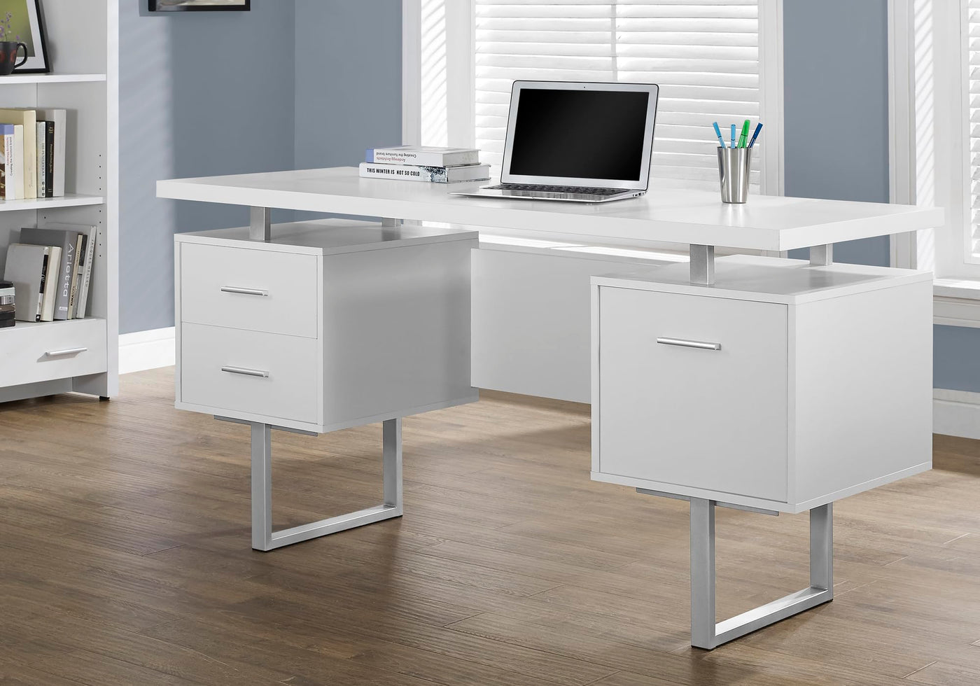 Sleek and contemporary, this white desk is the perfect combination of function, durability and design in a modern form. With clean lines, a floating top work station and sleek track metal legs, this desk will add pizzaz to any home office. Featuring two storage drawers and a file drawer to help keep you organized with a large desktop surface to provide plenty of room for all your hardware and working needs.