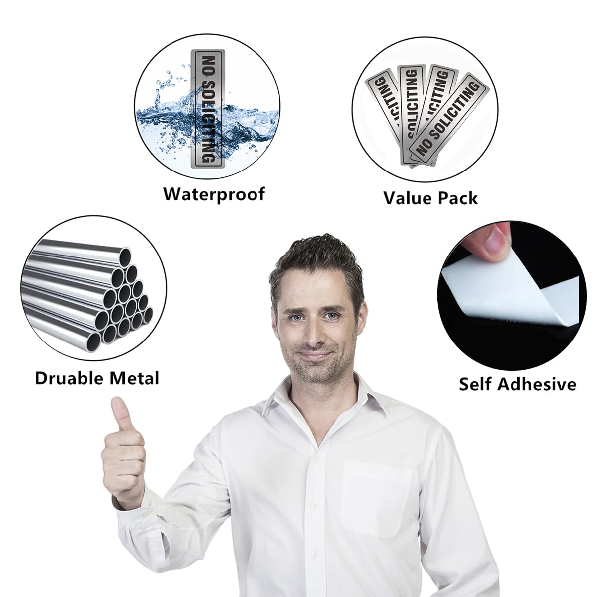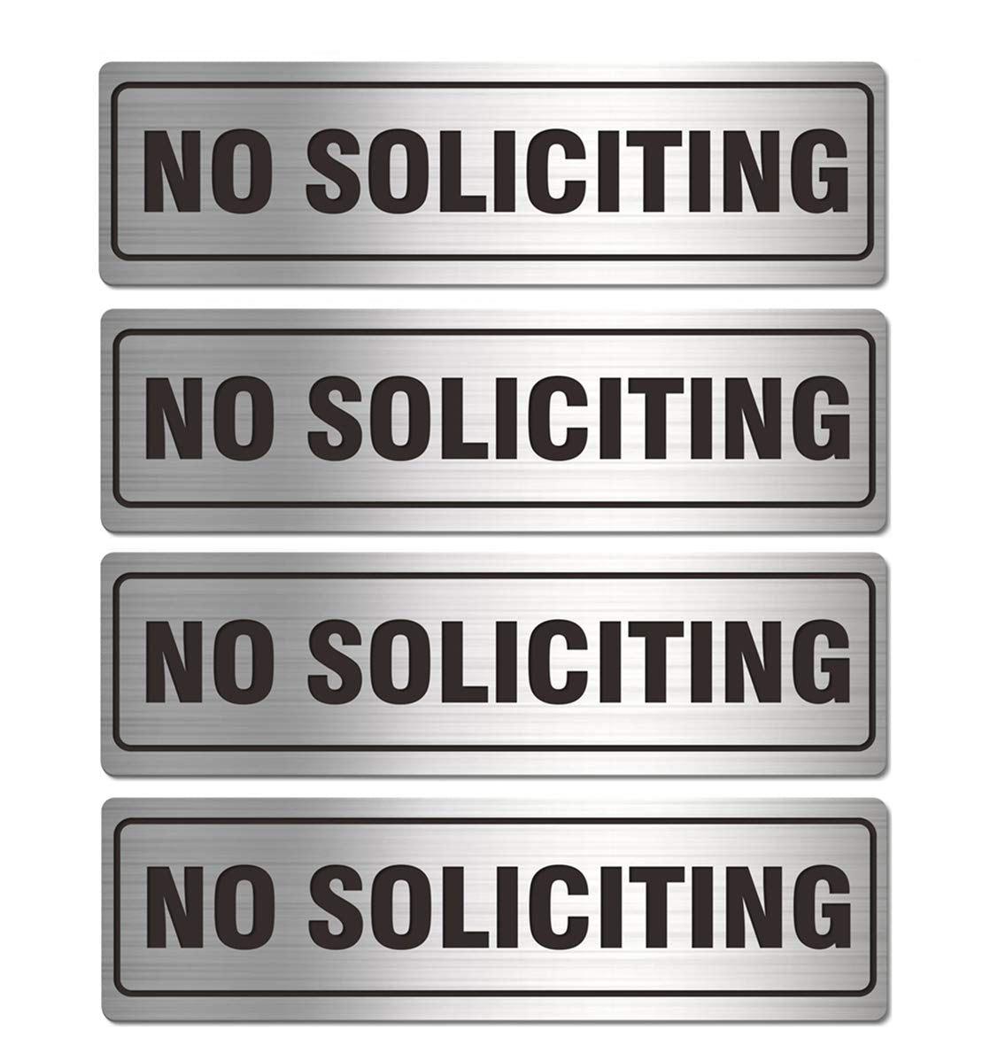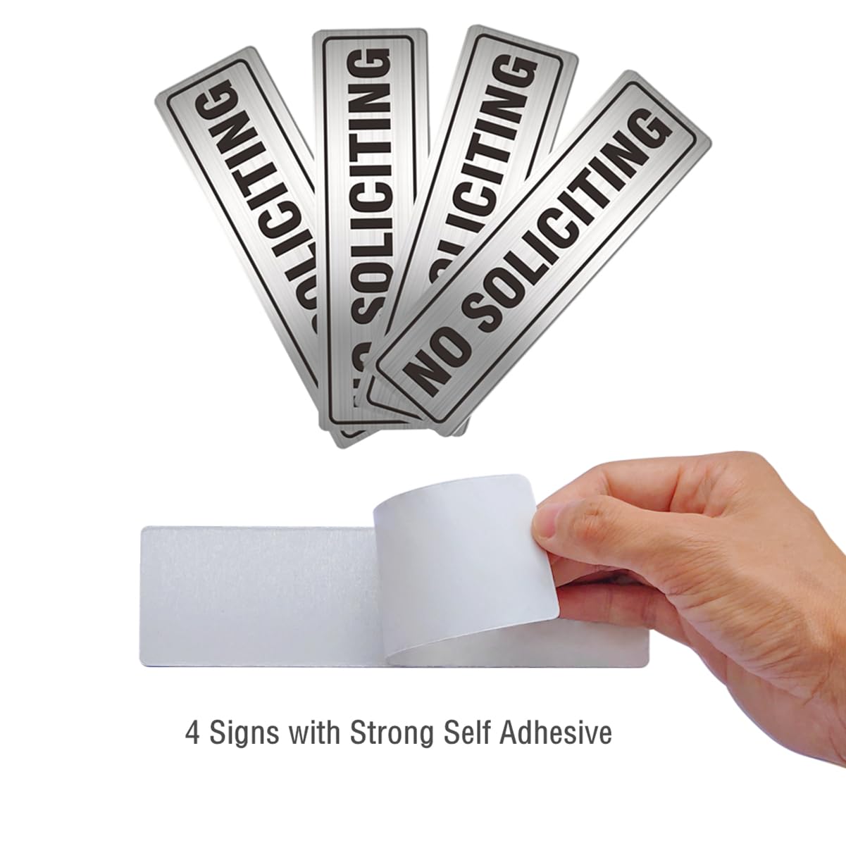 No Soliciting Sign For House Door 7.0' X 2.0' Signs For Business Home Office Wall With Strong Self Adhesive Aluminum Metal Signboard Keep Solicitors Away (4 Pack, Silver 7 X 2 Inches) What Is The Difference In Our No Soliciting Sign ? ? 1.Strong Self Adhesive, Never Falls Off. ? 2.Durable Thick Aluminum Metal Sign. ? 3.Double-Sided Tapes For Spare Use. ? 4.Highly Visible & Simple Design. ? 5.Weather Resistant & Never Fade. ? 6.Value Pack Of 4 No Soliciting Signs. Item Specifications: ? Color: Silver ? Item Weight: 0.8 Ounces ? Material: Durable Aluminum ? Style: Simple, Modern, Rectangle ? Quantity: 4 Pack Of No Soliciting Signs ? Size: 7.0'W X 2.0'H (18.0 5.0Cm) Package Includes: ? 4 No Soliciting Sign ? 4 Double Sided Tape ? 1 Installation Instruction ? 1 Self Sealing Opp Bag How To Install Your New Sign ? ?Steps: Clean ? Peel ? Stick ? Press ? 1. Choose An Appropriate Height For The No Soliciting Sign. ? 2. Thoroughly Clean The Substrate To Remove Dust, Grease, Or Silicone Before Applying. ? 3. Tear Off The Self-Adhesive Backing To Expose The Glue. Do Not Touch The Adhesive Side. ? 4. Apply The Sign To The Target Surface And Press Firmly With Your Hand For About Ten Seconds.