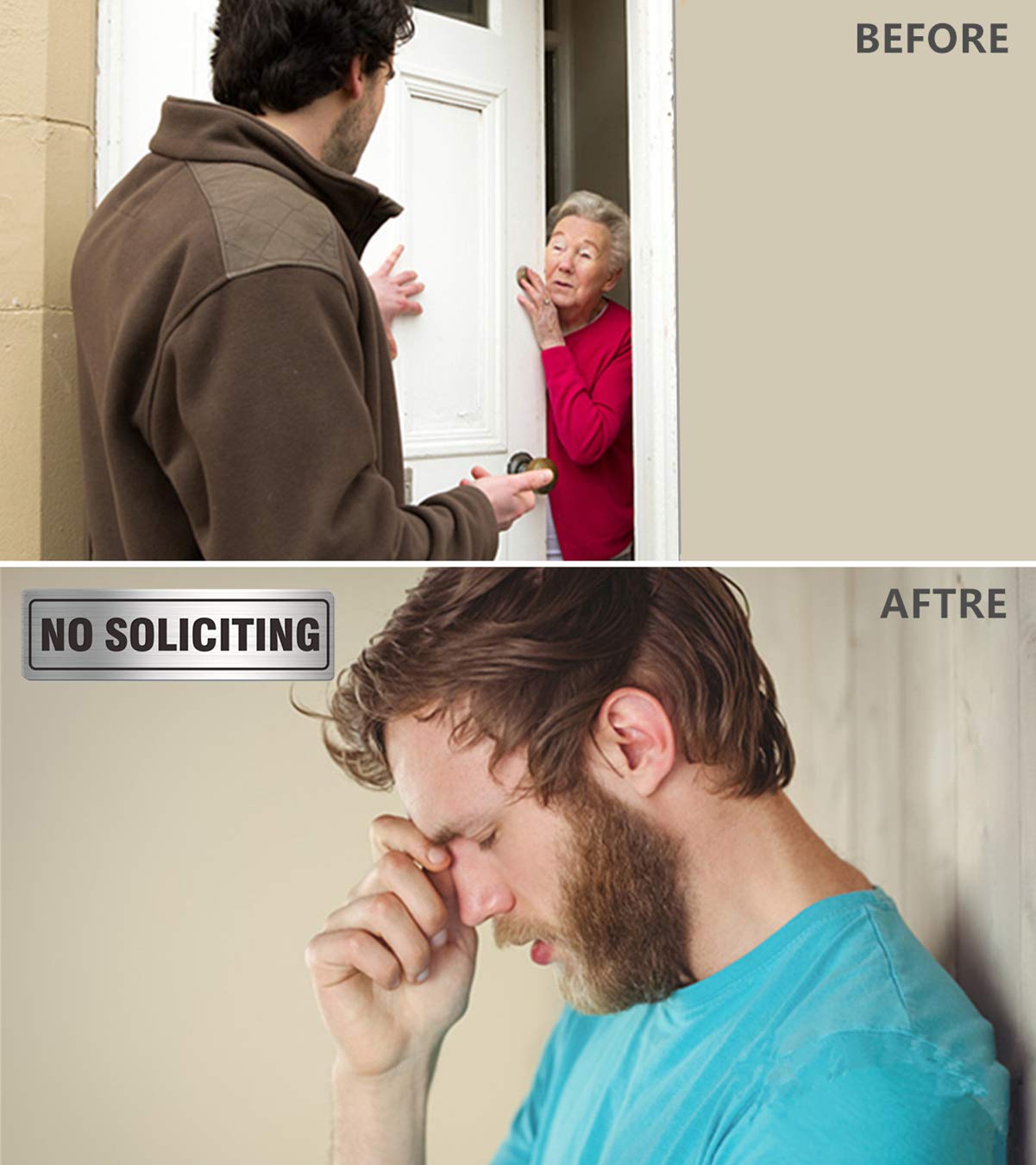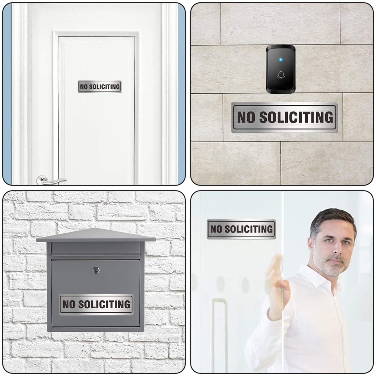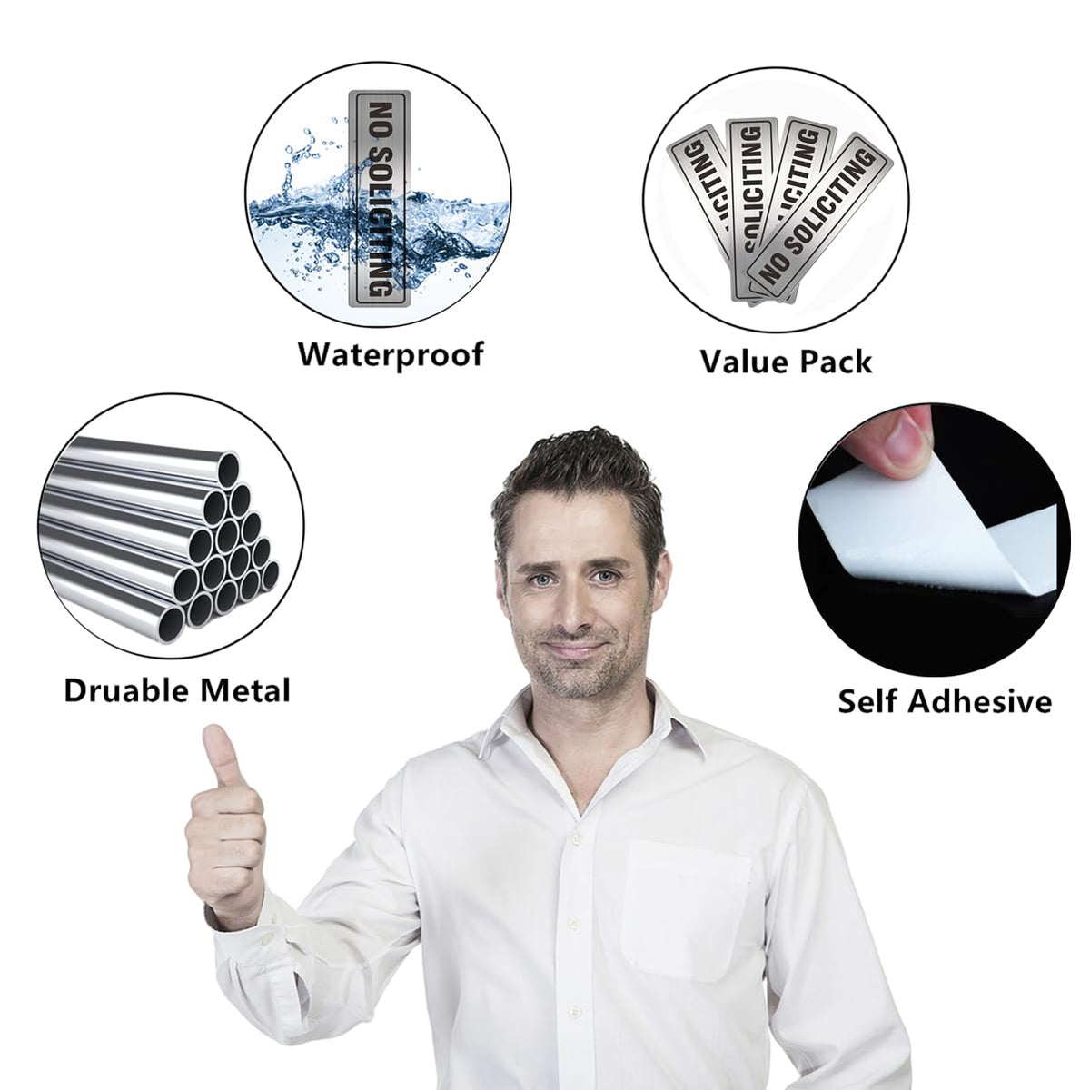 No Soliciting Sign For House Door 7.0' X 2.0' Signs For Business Home Office Wall With Strong Self Adhesive Aluminum Metal Signboard Keep Solicitors Away (4 Pack, Silver 7 X 2 Inches) What Is The Difference In Our No Soliciting Sign ? ? 1.Strong Self Adhesive, Never Falls Off. ? 2.Durable Thick Aluminum Metal Sign. ? 3.Double-Sided Tapes For Spare Use. ? 4.Highly Visible & Simple Design. ? 5.Weather Resistant & Never Fade. ? 6.Value Pack Of 4 No Soliciting Signs. Item Specifications: ? Color: Silver ? Item Weight: 0.8 Ounces ? Material: Durable Aluminum ? Style: Simple, Modern, Rectangle ? Quantity: 4 Pack Of No Soliciting Signs ? Size: 7.0'W X 2.0'H (18.0 5.0Cm) Package Includes: ? 4 No Soliciting Sign ? 4 Double Sided Tape ? 1 Installation Instruction ? 1 Self Sealing Opp Bag How To Install Your New Sign ? ?Steps: Clean ? Peel ? Stick ? Press ? 1. Choose An Appropriate Height For The No Soliciting Sign. ? 2. Thoroughly Clean The Substrate To Remove Dust, Grease, Or Silicone Before Applying. ? 3. Tear Off The Self-Adhesive Backing To Expose The Glue. Do Not Touch The Adhesive Side. ? 4. Apply The Sign To The Target Surface And Press Firmly With Your Hand For About Ten Seconds.