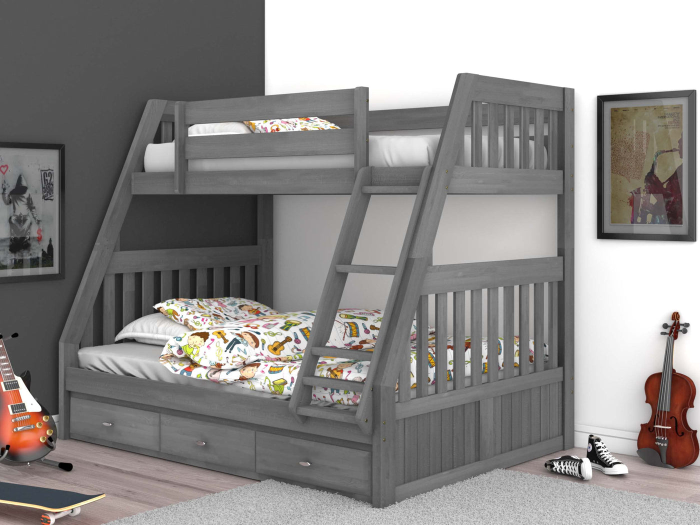 DescriptionThis ready-to-assemble unit in a fashionable charcoal grey finish features a twin over full bunk bed with a three-drawer under-bed storage unit. The drawers feature metal guides and attractive chrome pulls. Quality and solid wood construction makes this bed a great buy.