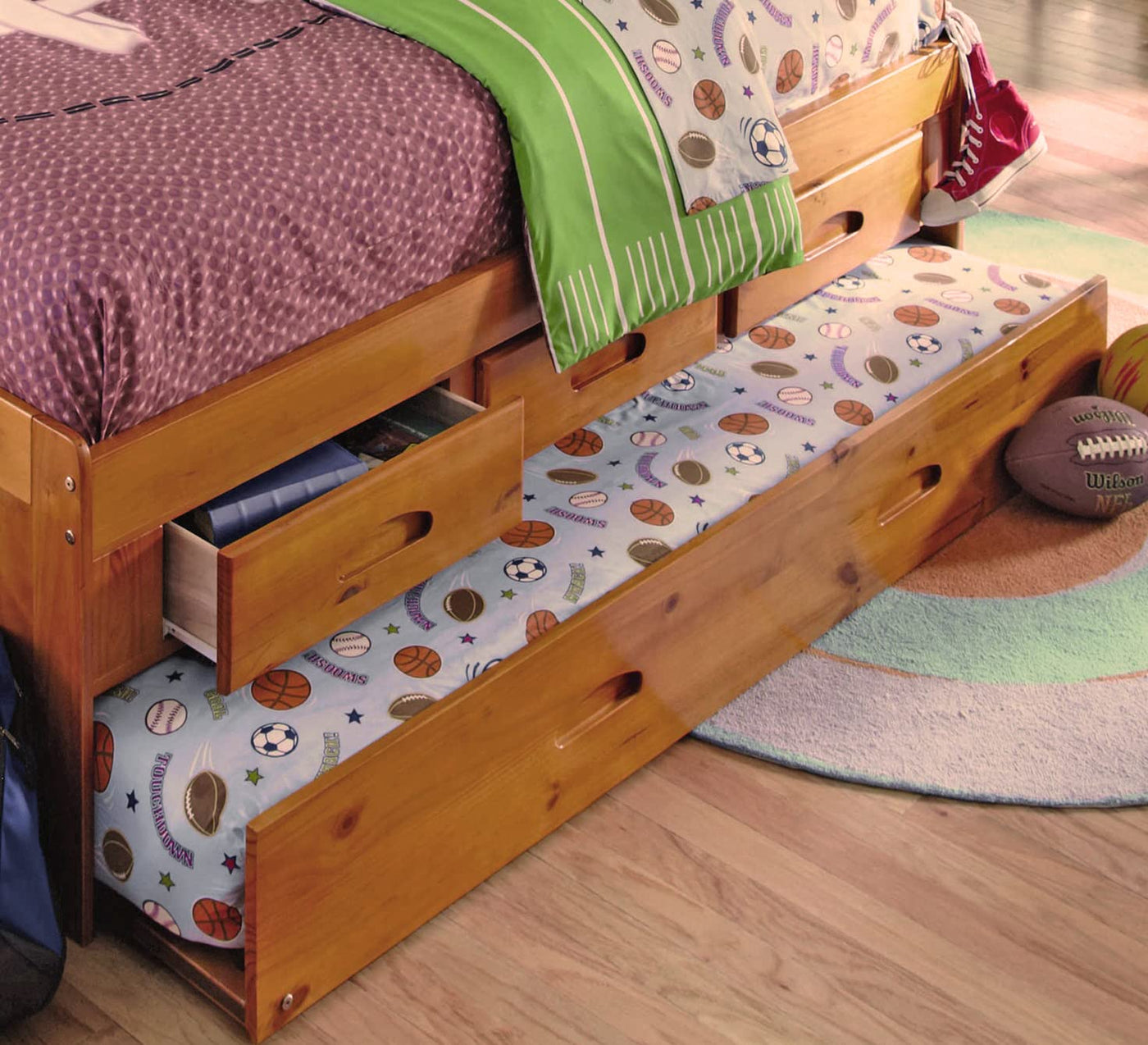 Add class to your child's bedroom with this full size bookcase headboard daybed in a warm honey finish! The ready-to-assemble unit provides 3 drawers of storage along with a twin trundle bed. Additional underbed storage is accessible from either end of the bed. Quality and solid wood construction makes this bookcase daybed a great purchase.