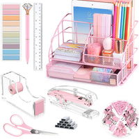 Pink Desk Accessories, Office Supplies Gifts Set 9Pc Including Mesh Desk Organizer, Tape Dispenser, Stapler, Staples, Ballpoint Pen, Clips Set, Ruler, Scissor And Sticky Tabs For Students, Office Clerks Packaging List 1Xmeatal Mesh Desk Organizer 1Xacrylic Tape Dispenser 1Xacrylic Stapler 1Xballpoint Pen 1Xscissor 1X4-Grid Clip Set(With 30 Paper Clips, 7 Large Binder Clips, 13 Small Binder Binders, 20 Thumbtacks) 1Xruler 1000Xstaples 200Xsticky Tabs