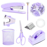 Purple Desk Accessories, Pink Office Supplies Set With Stapler, Tape Dispenser, Staple Remover, Pen Holder, Scissor, Binder/Pape