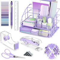 Purple Desk Accessories, Office Supplies Gifts Set 9Pc Including Mesh Desk Organizer, Tape Dispenser, Stapler, Staples, Ballpoint Pen, Clips Set, Ruler, Scissor And Sticky Tabs For Students, Office Clerks Packaging List 1Xmeatal Mesh Desk Organizer 1Xacrylic Tape Dispenser 1Xacrylic Stapler 1Xballpoint Pen 1Xscissor 1X4-Grid Clip Set(With 30 Paper Clips, 7 Large Binder Clips, 13 Small Binder Binders, 20 Thumbtacks) 1Xruler 1000Xstaples 200Xsticky Tabs