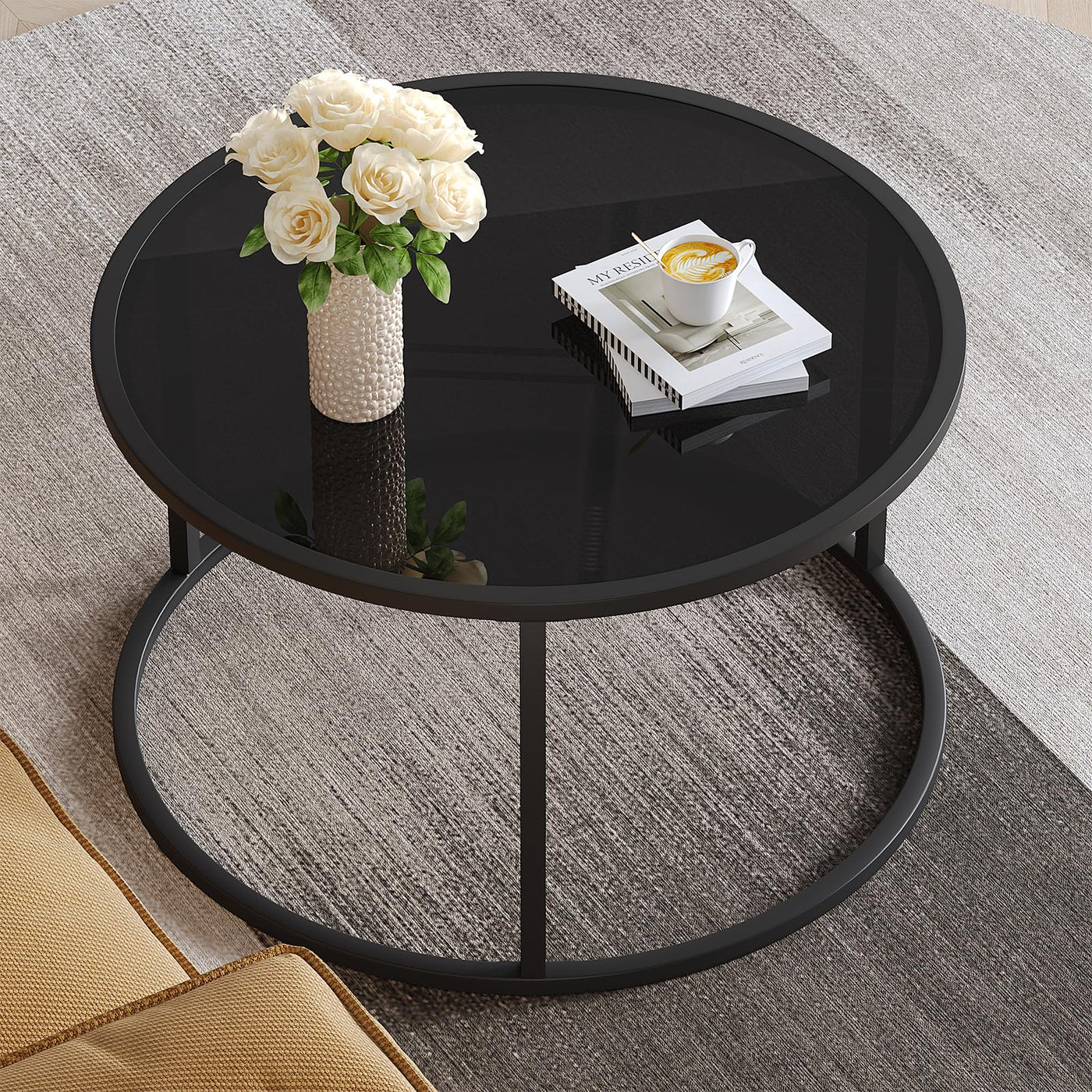 Round Black Glass CoffeFeatures: 1. Simple And Modern Design Style Meet Your Diverse Matching Needs, Suitable For Any Small Or Large Spaces. Make Of High-Grade 6Mm Explosion-Proof Tempered Glass And Sturdy Metal Legs, Which Can Support Up To100 Pounds 2. Measuring 27.6'D X 17.7'H, Not Too Tall Or Small, Which Is Perfect For Sofa Or Chair Side, A Ideal Table For Living Room, Office, Apartment Or Any Large Or Small Space. 3. Super Easy To Assembly, Only A Few Minutes, You Will Get A Simple But Chic Modern Coffee Table. 4. High-Grade Clear Glass Tabletop With Sturdy Black Metal Legs, Modern And Elegant Style Catches Your Eyes At A Glance. And It Never Goes Out Of Style. 5.?Designer Brand?Our Black Round Coffee Table Adopts Unique Design And Decorative Art To Add More Beauty And Fashion To Your Life.