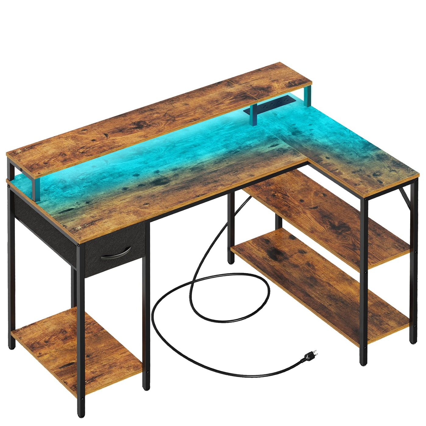 Superjare L Shaped Gaming Desk With Led Lights & Power Outlets, Reversible Computer Desk With Shelves & Drawer, Corner Desk Home Office Desk, Rustic Brown