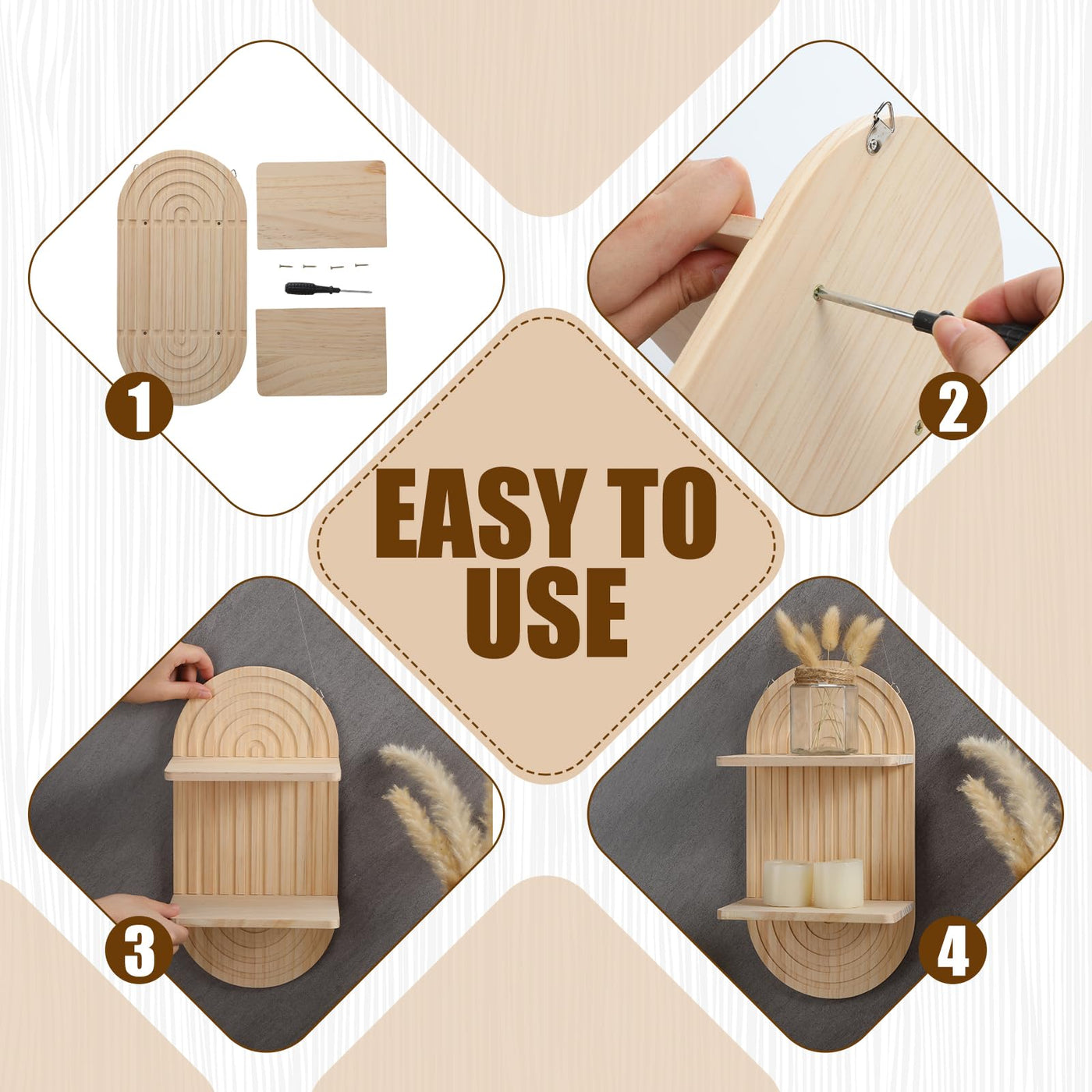 Features: Boho floating shelves kids room can withstand a certain level of weight, it is a piece of art you and your kids will adore for years. If you need to decorate your modern Bohemian farmhouse home, boho wooden wall book shelf is an ideal option. Specifications: Material: wood Color: as the picture shown Size: as the picture shown Package includes: 2 Sets of wood wall shelf Notes: Manual measurement, please allow slight errors on size. The color may exist a slight difference due to different screen displays. Please understand that candles and books in the picture are not included.