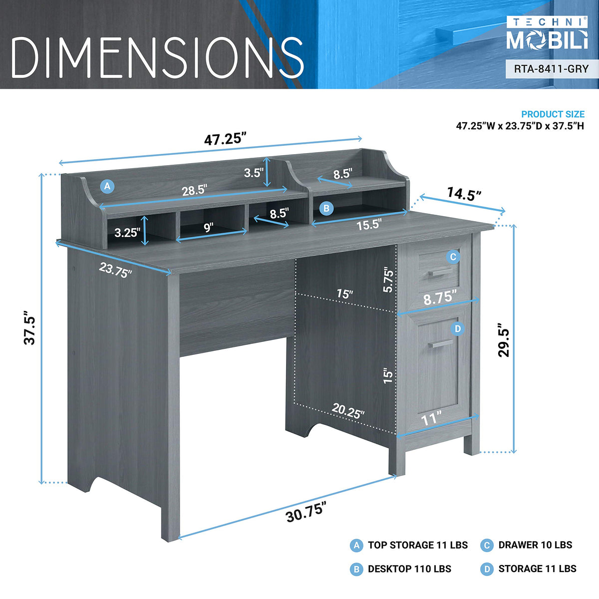 The Classic Office Desk From Techni Mobili Is A Must-Have For Your Home Office Or Workspace. It Reflects A Modern With Clean Lines Traditional Design. Manufactured With Wooden Panel, The Wooden Design Grey Finish Accentuates The Sleek Appearance Making It More Attractive. It Has A Built-In Hutch With Four Cubbyholes And Two Top Shelves For Storing And Organizing Your Office Essentials As Well Ample Space To Work Clutter-Free. It Also Features 1 Pullout Drawer And 1 Storage Door To Conceal Important Documents. Fully Finished Back With Privacy Panel Makes This Desk More Versatile. Place It Against A Wall Or Let It Stand Alone For A Beautiful Piece Both From The Front And Back.