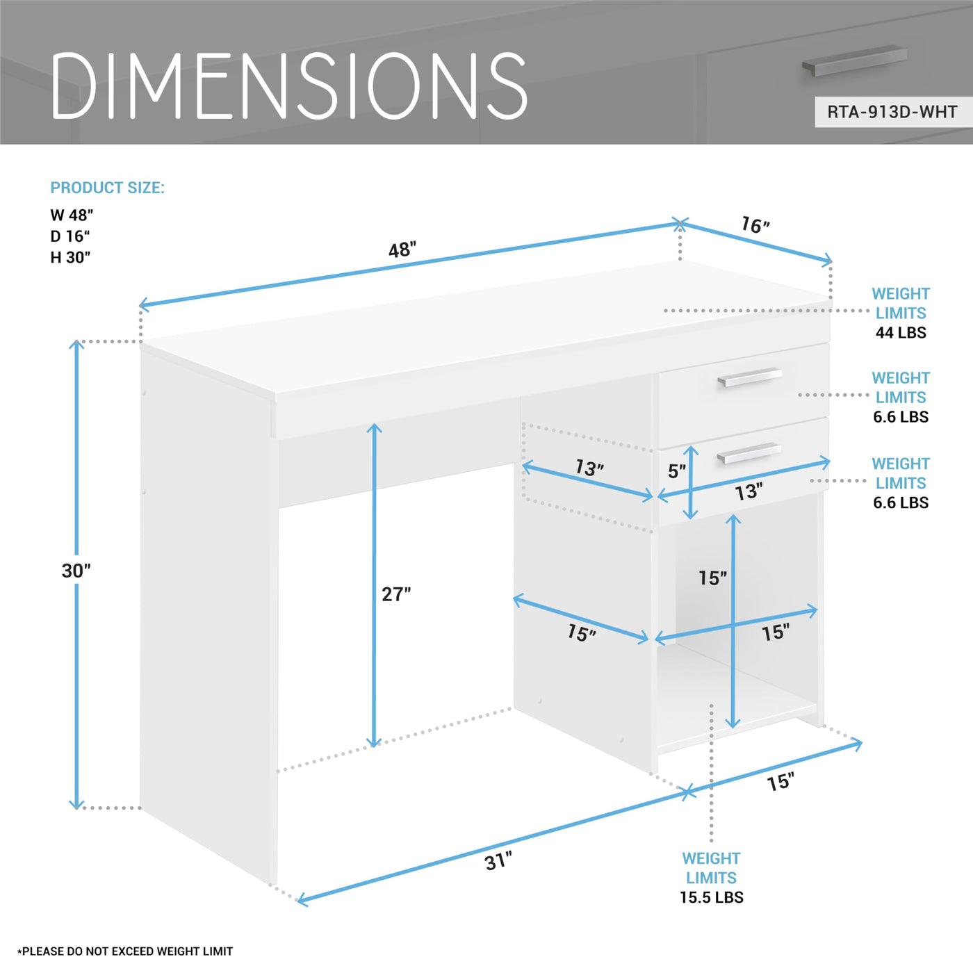 Techni Mobili Computer Home Office or Bedroom Storage & Drawers Ideal for Small Spaces Writing Desk, 47.6" W x 16.1" D x 30.3, White