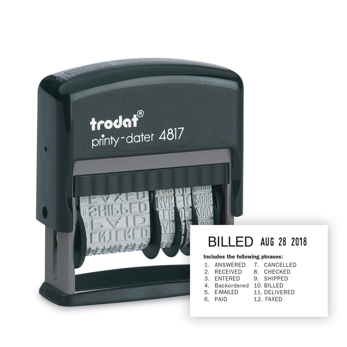 Product Descriptionthe Trodat Printy Is The Best Selling Self-Inking Stamp In The World, And Is Used In Offices, Homes, And On The Move. The Trodat Printy Helps You Reduce Time With Repetitive Writing Tasks, And Lets You Stamp Your Message, Date, Or Any Information You Need To Write Over And Over. Trodat Printy 4817 Self-Inking Economy 12-Message And Date Stamp Is The Perfect Way To Mark Your Important Documents. The Stamp Features A Standard Date Format Along With 12 Popular Messages Including: Paid, Billed, E-Mailed, Shipped And More! With The Built In Ink-Pad You Will Get Thousands Of Crisp, Clear Impressions Before Re-Inking, And At Least 10 Years Of Date Bands. Replacement Pads Are Available On Amazon. Stop Writing And Start Stamping When You Buy The Trodat Printy 4817 Self-Inking Economy 12-Message And Date Stamp Today!From The Manufacturerdate Stamp Imprints The Date After One Of 12 Popular Phrases: Answered, Backordered, Cancelled, Billed, Received, Charged, Checked, Delivered, Entered, Paid, Shipped And Faxed. Ten-Year Date Band Includes Months And Days. Impression Size Is 3/8' X 2'. Stamp Delivers 10,000 Impressions And Is Made With A High Percentage Of Recycled Material. The Frame Is Made Of Plastic.