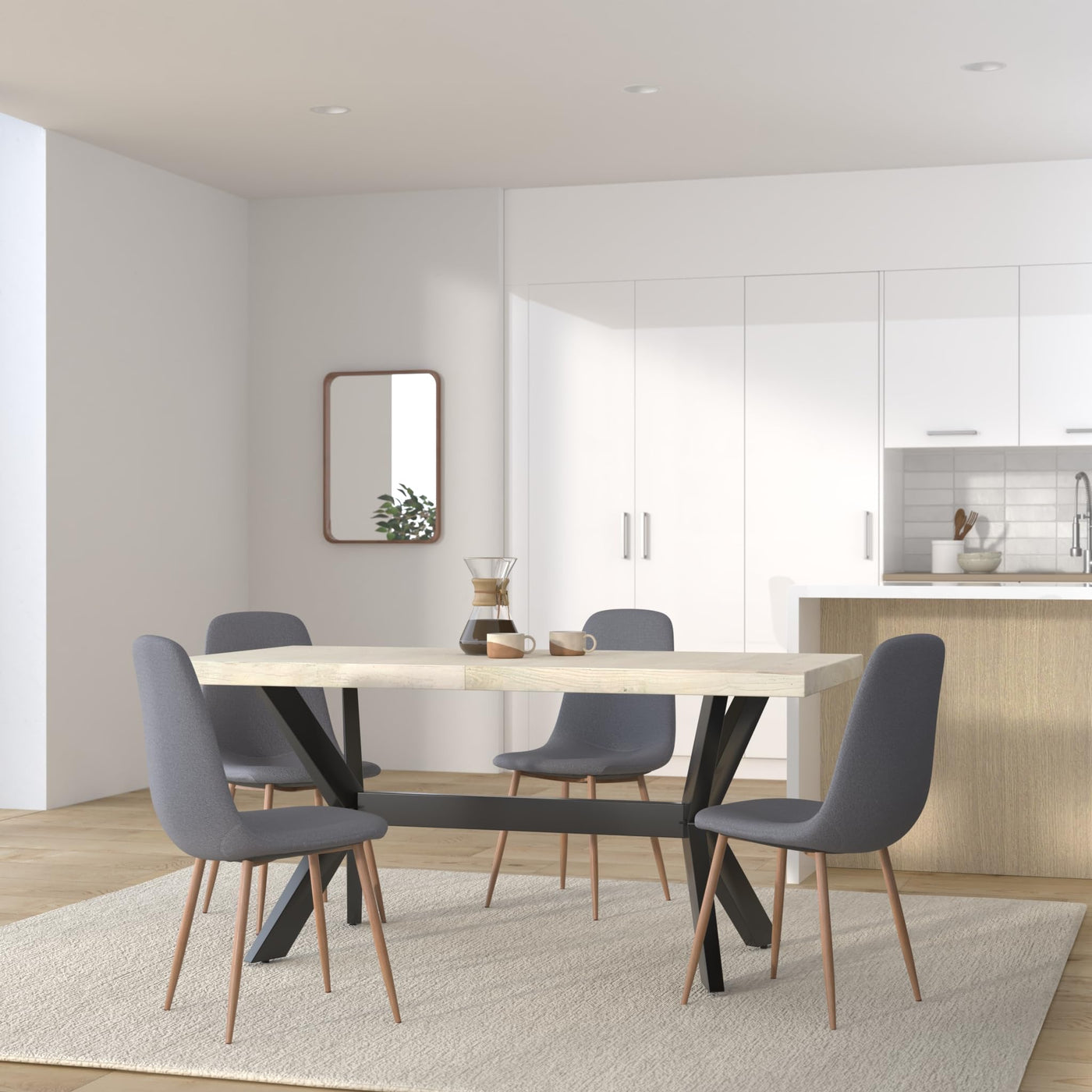 Important note: The bleached mango wood shows natural grains, making each of the dining tables unique and slightly different from the next; the delivery is random. Color: White and black Material: Solid mango wood + powder-coated steel legs Dimensions: 63" x 31.5" x 29.5" (L x W x H) Polished and lacquered With a steel cross frame