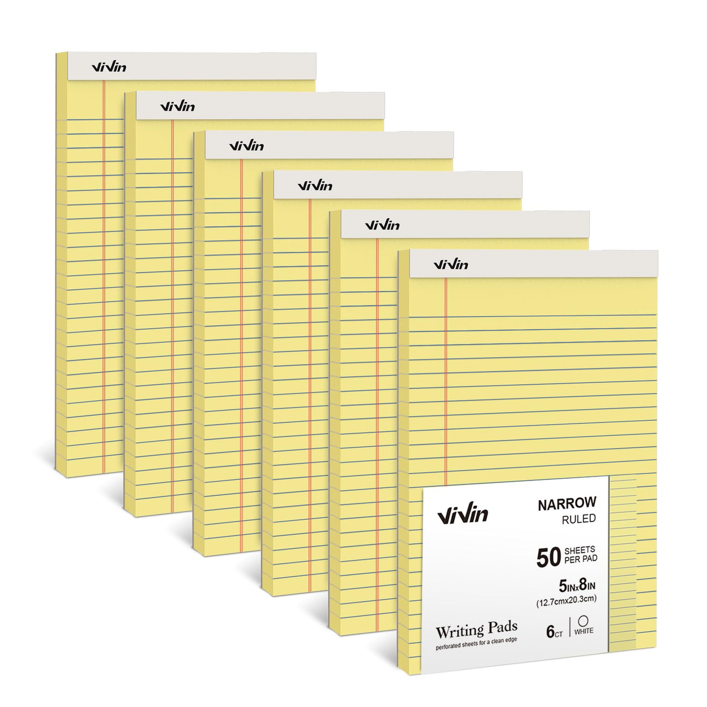 Vivin 5 X 8 Inch Legal Pads, 6 Pack, Narrow Ruled, 50 Sheets Per Writing Pad, Perforated Note Pads Ideal For Home, Office, Busin