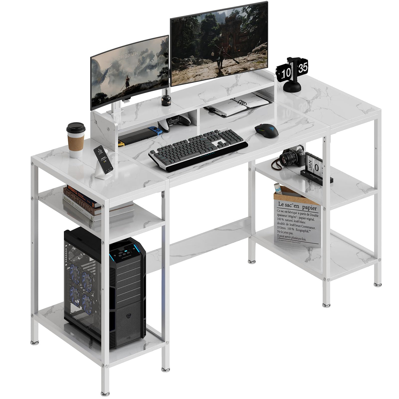 Vivomexisaura Gaming Home Office Computer Desk With Monitor Stand, Writing Desk For 2 Monitors, Adjustable Storage Space (Marble