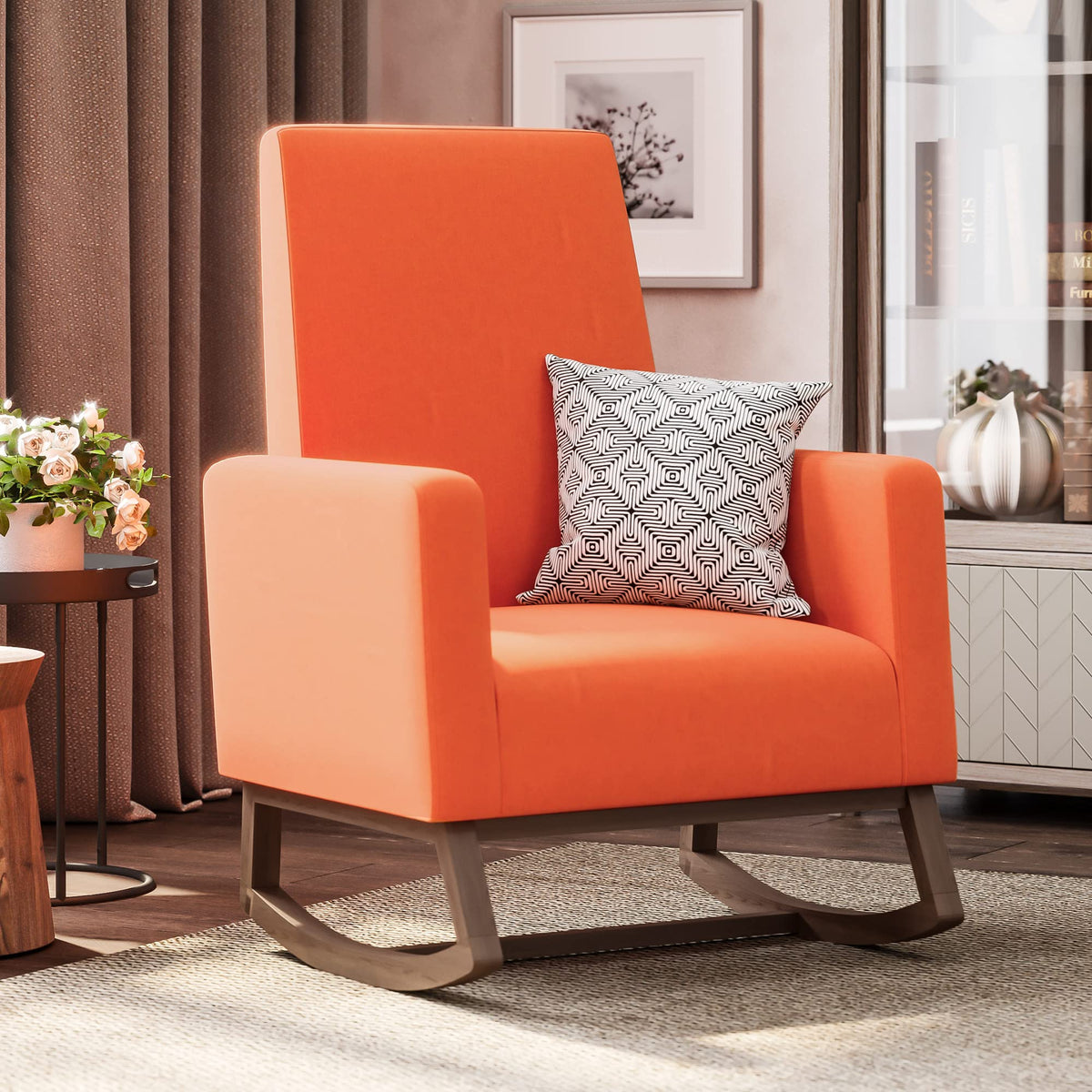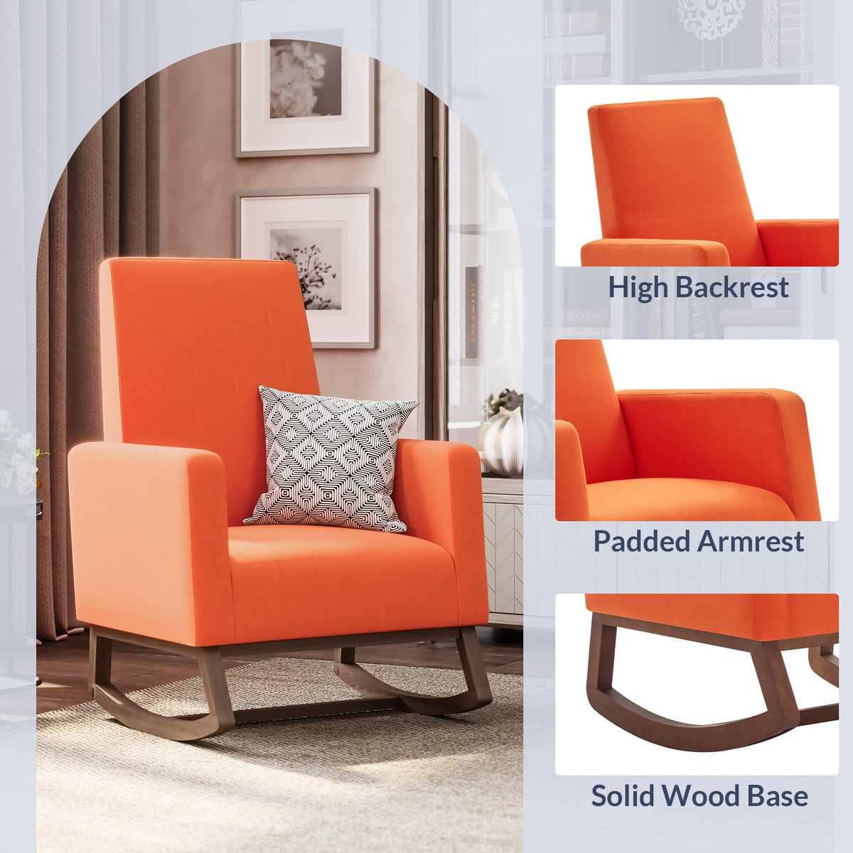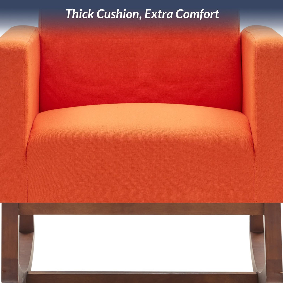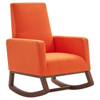 Bring home this rocking chair to sit back and relax after a long day at work. Take a load off while reading your favorite book or enjoy some cherished family memories while leisurely rocking in this accent chair. It's not just a cozy furniture accessory, but a stylish piece that's sure to spice up your living room, bedroom, or study. Mid-century design meets modern styling with plush upholstery for a classic touch. The bright orange hued fabric upholstery adds a dash of color and is a great way to mix and match tones and textures. A gentle rocking motion lends a soothing feel not just for adults, but it's also very calming for babies. Use it in your child's nursery to rock your newborn to sleep or to find yourself a comfy spot while nursing or feeding the baby. The high backrest supports the body for ergonomic seating posture, reducing back pain or fatigue. Soft cushions and padded arm rests deliver optimal support for the best seating experience. The sturdy wood frame and wood rails ensure greater strength and stability, so you can sit and enjoy this rocker with more confidence. It's a high weight capacity chair that can easily support up to 300 lbs. Requires simple and minimal assembly and comes with all necessary hardware and instructions. Overall dimensions of this rocking chair are as follows: 35.04'D x 27.56'W x 41.33'H .