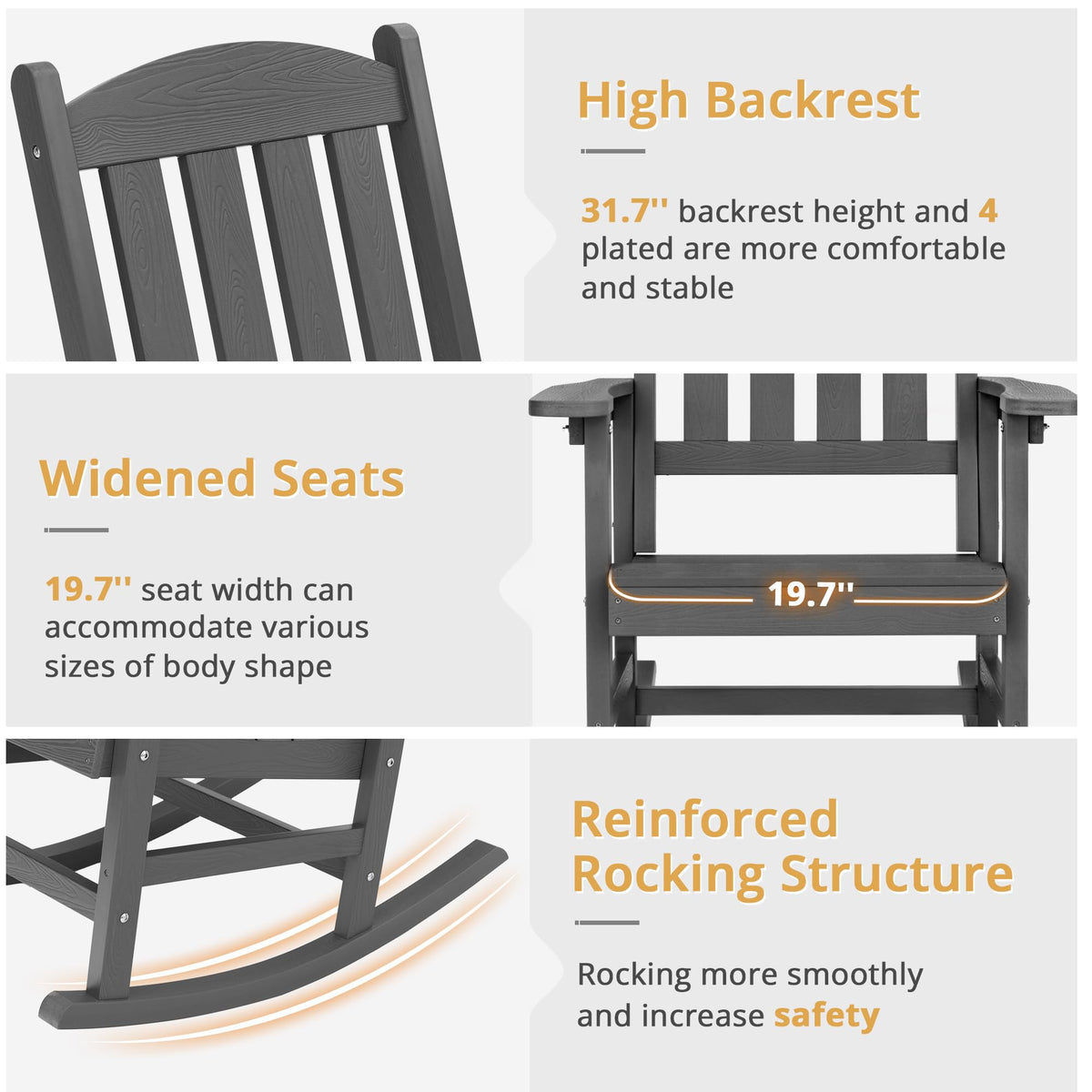 Weather Resistance: The Rocking Chair Is Crafted With Hdps With Excellent Durability Which Will Not Fade, Crack, Peel; It Can Withstand Various Environmental Pressures, Including Sun, Snow And Strong Wind, The 304 Stainless Steel Screws Connected Make The Chair More Long-Lasting | Maximum Comfort: Boasting Dimensions Of 35.2'' D X 25.9’’ W X 41.7’’ H, This Patio Rocking Chair Offers An Extra Higher 31.7’’ Raised Backrest That Relieves Any Tension In Your Neck; 19.7’’ Wide Seat Is Contoured To Support A Natural Sitting Position; The Smooth Slat Corners Prevent Accidental Bumps | Anti-Rollover: The Porch Rocker Features Four Supporting Points With Cross Bars, These Front Porch Rocking Chairs Evenly Disperse The Pressure To Each Point; The Accurate Calibration Of The Rocking Radian Ensures Personal Safety, Enhances Balance, And Achieves Ultimate Relaxation | Modern Style: The Rocking Chair Is A Simple And Elegant Style That Can Blend Perfectly Into Any Decor; The Anti-Wood Surface With Classic Color Adds Movement And Lightness To The Chair; You Can Sit On It To Enjoy Leisure Time In The Living Room, Garden, Patio, Balcony, And Other Areas | Easy To Assemble And Maintain: Clear Instructions And High-Quality Hardware Make Assembly Very Easy; No Need To Paint Or Stain During Maintenance, Just Clean With Soap, Water, And A Soft Brush Or Sponge, No Other Maintenance Is Required