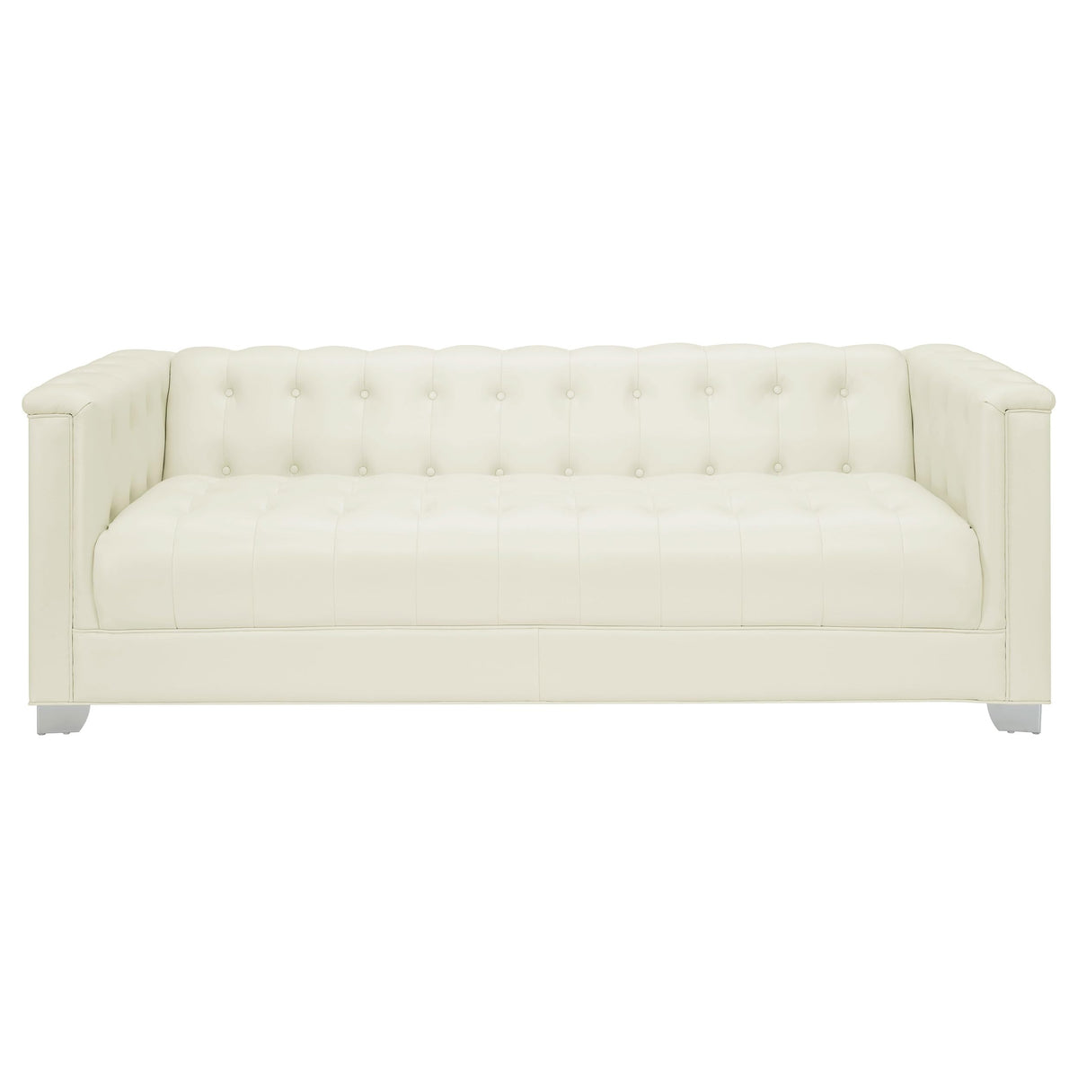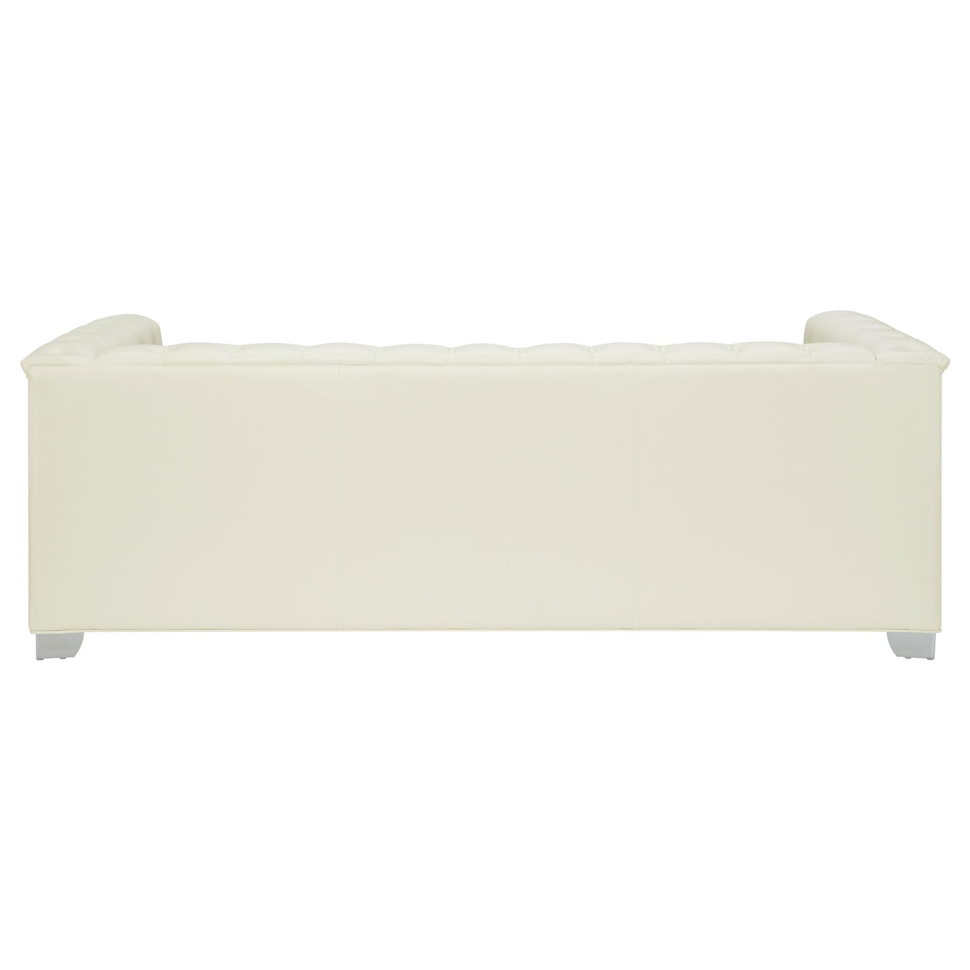 Sleek lines and chic details elevate this glamourous three piece living room set. With a contemporary styling low profile, the silhouette of the sofa, loveseat, and chair are modern. Deep button tufting and quilted detailing are given a crisp feel with white padded, breathable leatherette upholstery. Stylishly bright, the chrome heavy duty doorknocker handles and legs create visual intrigue. Dress up a space with the light hues and radiant metallic details.FeaturesThis low profile set is great for any room in need of some bling Covered in a padded, breathable leatherette and deep button tufting, this set is stylish and inviting Rhinestone details and chrome legs with matching door knockers give it the ultimate luxe appeal All cushions are attached for a sleek and contemporary lookDimensions:Sofa Assembled Product: 87 inches wide x 35.5 inches deep x 29.5 inches high Weight Capacity: 300 poundsLoveseat Assembled Product: 60 inches wide x 35.5 inches deep x 29.5 inches highChair Assembled Product: 40 inches wide x 35.5 inches deep x 29.5 inches highAt Coaster, we are your premier source for exquisite furniture, offering diverse styles to enhance every aspect of your life. Our passion for excellence drives us to innovate, crafting budget-friendly furniture that complements your lifestyle. Explore our brands for endless design inspiration and make your living experience exceptional with thoughtfully designed, affordable pieces that inspire a life well-lived.