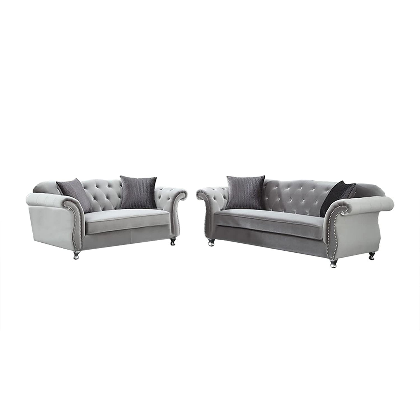The Epitome Of Chic And Glamorous, This Two-Piece Living Room Set Is Perfect For A Stylish Space. With Rolled Arms, The Classic Silhouettes Of The Sofa And Loveseat And Given A Modern Makeover With Silver Upholstery. Elegant Button Tufting Adorns The Back Cushions And Adds Depth. Bright Chrome Legs Feature Rounded Tapered Details. Transform Any Space With The Radiant Hues And Fashionable Accents.Featureseye-Catching Glam Sofa Collection Elegant Rolled Arms Accented With Individually Placed Chrome Nailheads Inside Arms And Soft Camel Backrest Beautifully Tufted And Adorned With Sparkling Crystals Queen Anne Legs In A Chrome Finish Accentuate A Graceful, Curved Silhouette Bench Seating And Textured Accent Pillows Complement The Silver Velvet Upholsterydimensions:Sofa Assembled Product: 91.25 Inches Wide X 34.75 Inches Deep X 34 Inches High Weight Capacity: 300 Poundsloveseat Assembled Product: 76.25 Inches Wide X 34.75 Inches Deep X 34 Inches Highat Coaster, We Are Your Premier Source For Exquisite Furniture, Offering Diverse Styles To Enhance Every Aspect Of Your Life. Our Passion For Excellence Drives Us To Innovate, Crafting Budget-Friendly Furniture That Complements Your Lifestyle. Explore Our Brands For Endless Design Inspiration And Make Your Living Experience Exceptional With Thoughtfully Designed, Affordable Pieces That Inspire A Life Well-Lived.