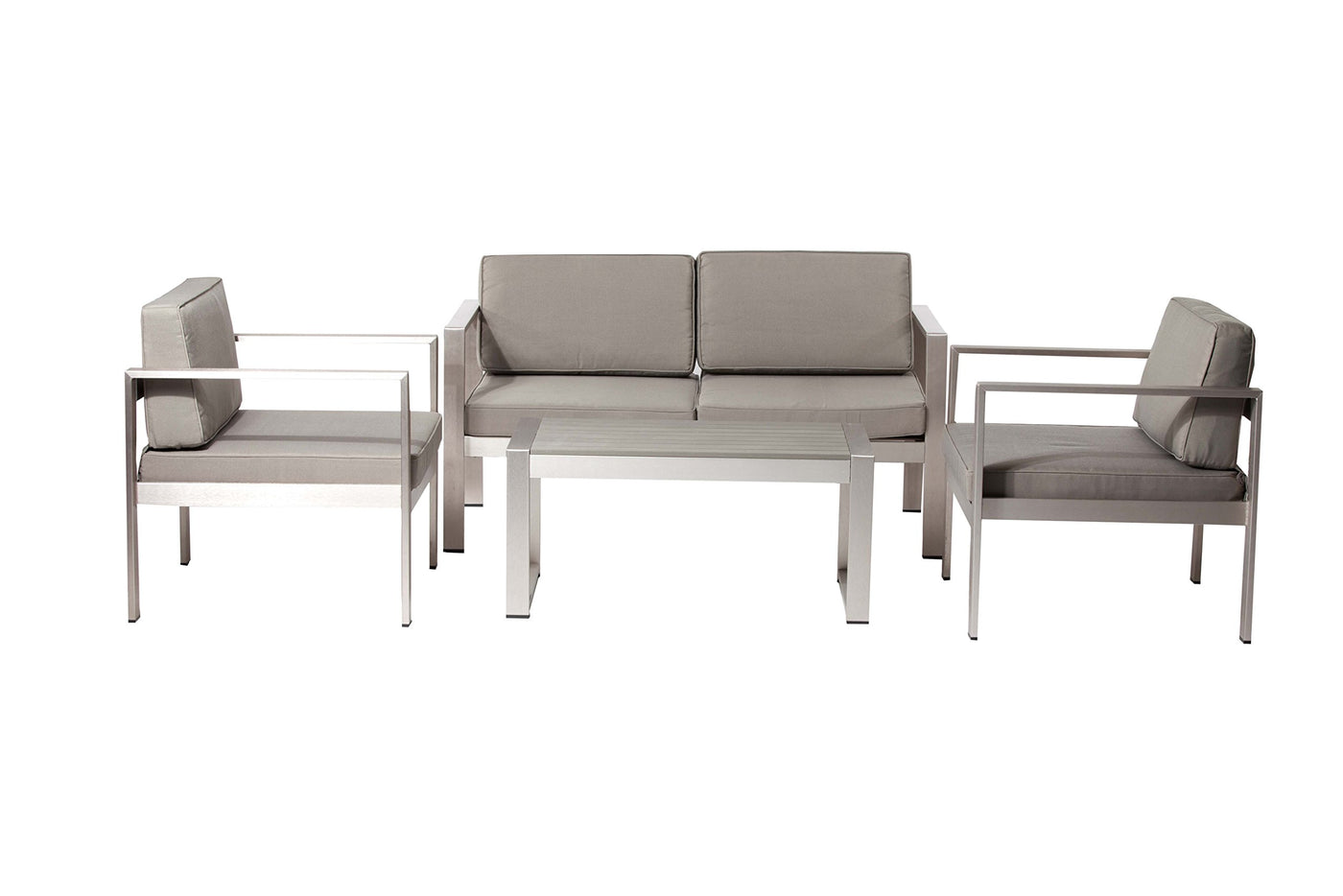 4 Piece Outdoor Lounge Set. This Set Comes With 2 Arm Sofa Chairs, 1 Two- Seater, And 1 Coffee Table. You Will Love This Set For Its Mix Of Aluminum And Upholstery. All Pillows And Cushions Are Removable. So, Create The Look You Love. Seat Height Is 19 Inches; Back Cushion Thickness: 3 Inches; Seat Cushion Thickness Is 4 Inches