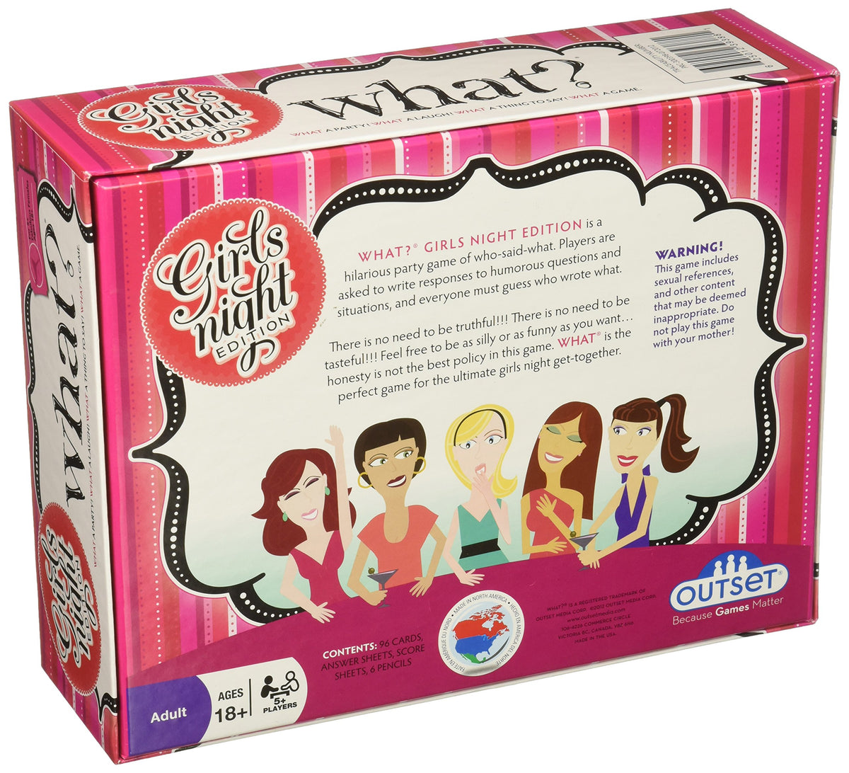 What? Girls Night Edition Is Hands Down The Best Board Game For Adults Of The Female Persuasion; In Other Words, ''Girls Only!''. What? Girls Night Edition Is Tailored For A Fabulous And Fun Girls Night. Girls Will Boldly Tell The Truth Or Tell Bold Face Lies, But All In Good Fun! Like The Original What? Party Game, There Are Three Types Of Questions To Be Played. The General Question Is Great For Starting Off The Game. Then Move To The Fill-In-The-Blank Question And You Could Use A Famous Person'S Name Or The Name Of A Girl At The Party! The Third Cateogry, Sticky Situation, Sets Up A Story To See What You Would Do, Which Is Always Fun!This Is A Fun And Silly Party Game For A Bachelorette Party, A Girls Night, A Retreat, Or At A Family Reunion For When The Men Go Out To Do Their 'Manly Things'! There Is No Need To Be Truthful! There Is No Need To Be Tasteful! Feel Free To Be As Silly Or As Funny As You Want Honesty Is Not The Best Policy In This Game!