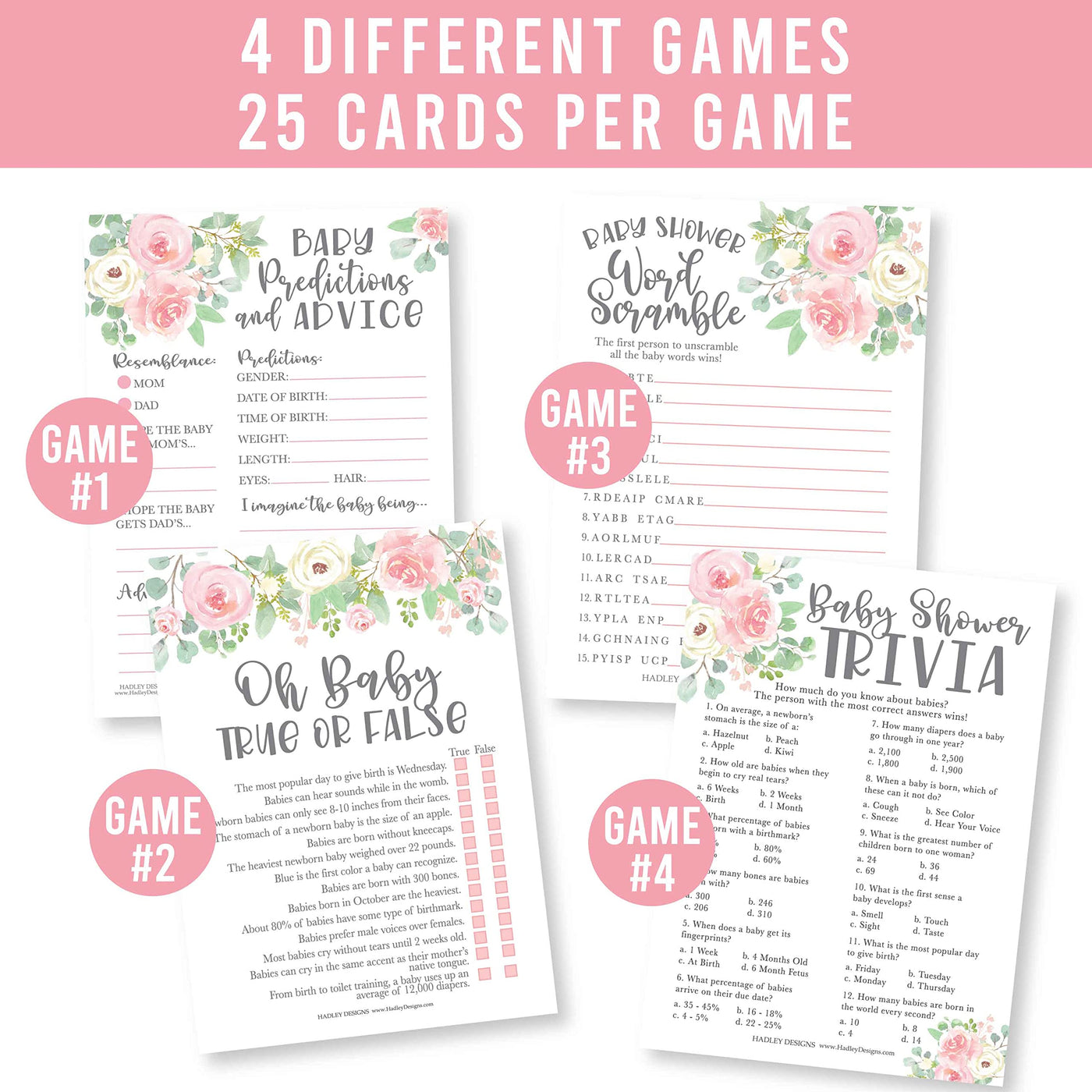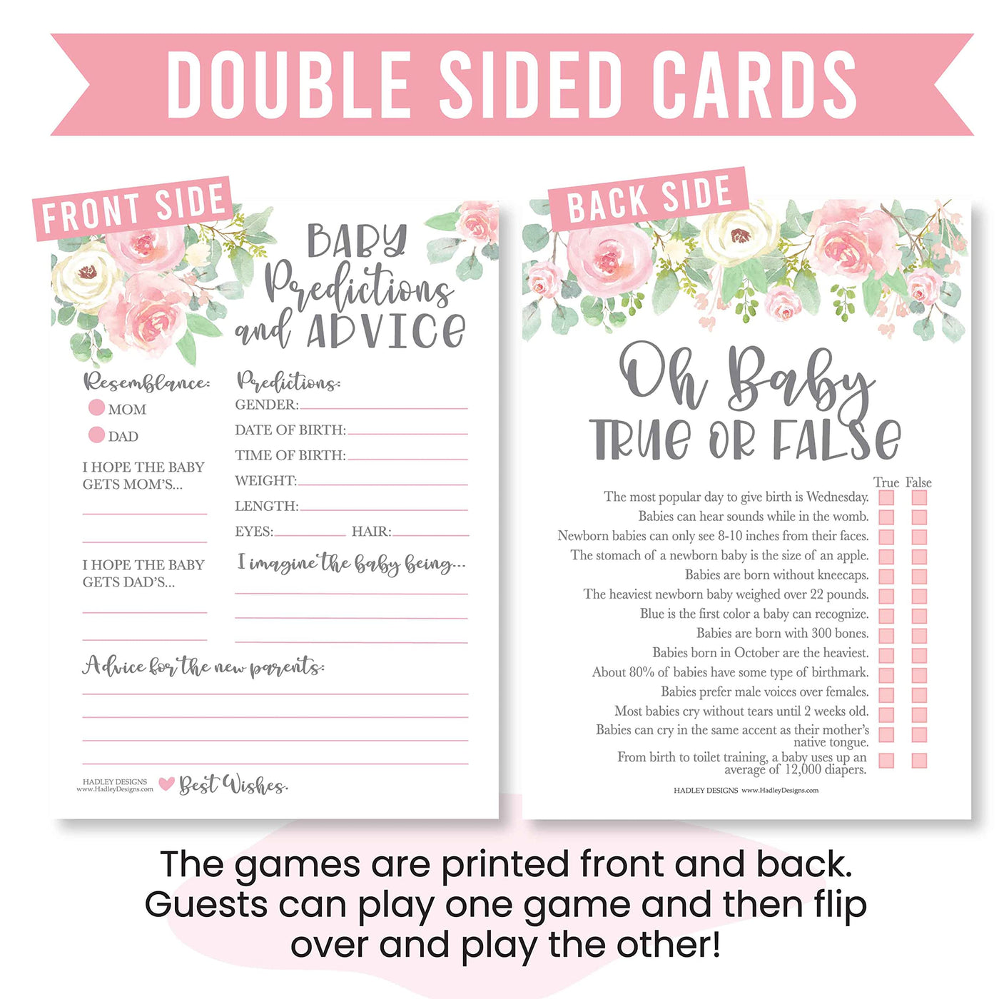 Hadley Designs Floral Baby Shower Games For Girls - 50 Cards, Two 25-Game Sets, 4 Games Double Sided, Baby Prediction And Advice