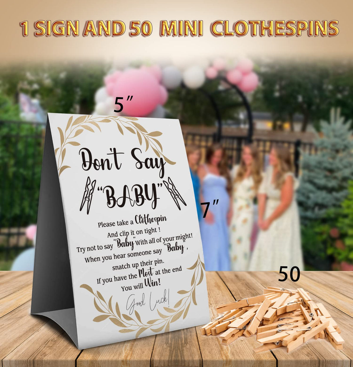 Muruseni Don'T Say Baby Clothespin Games Sign(1 Sign + 50 Mini Clothespins), Baby Shower Games, Golden Leaf,Gender Neutral Baby