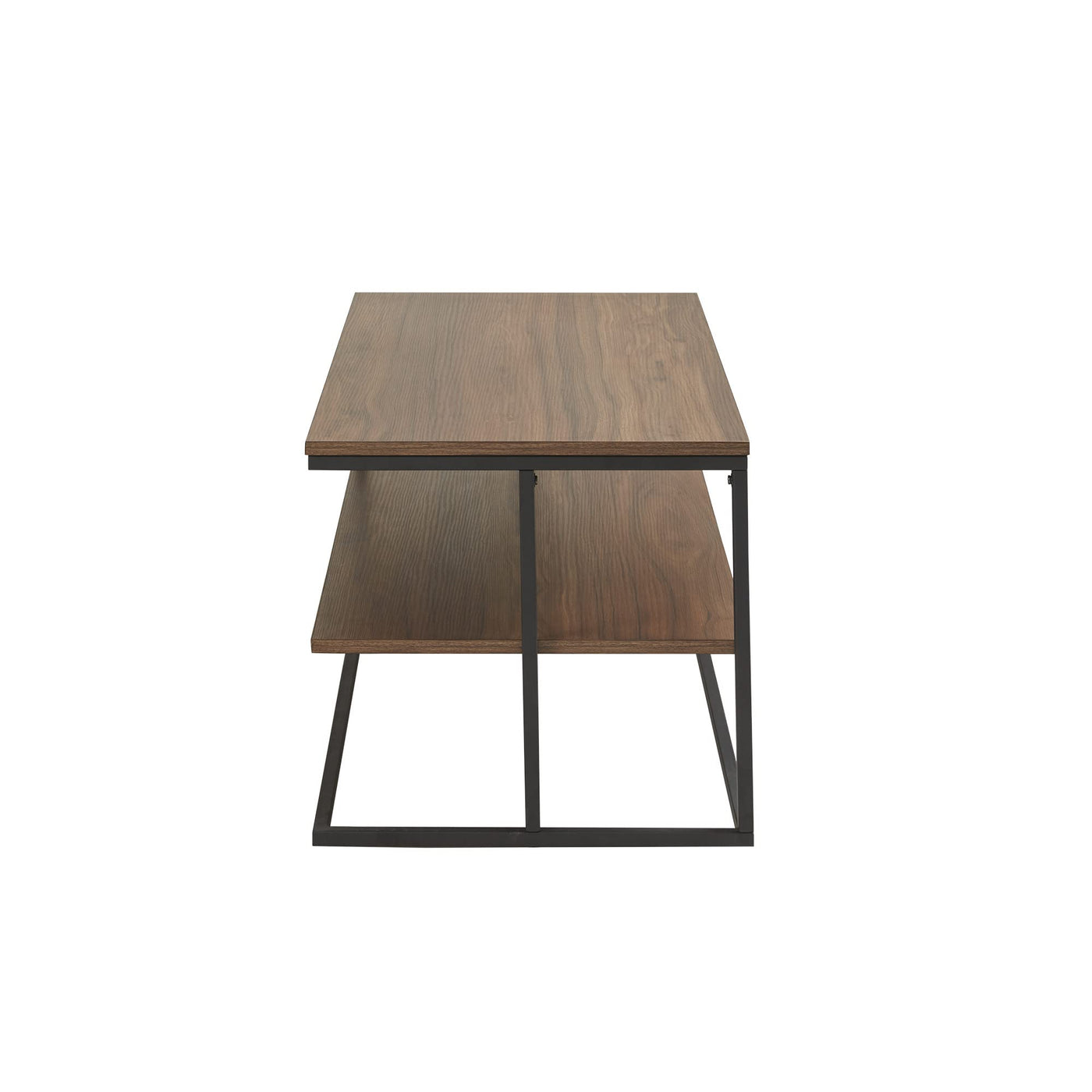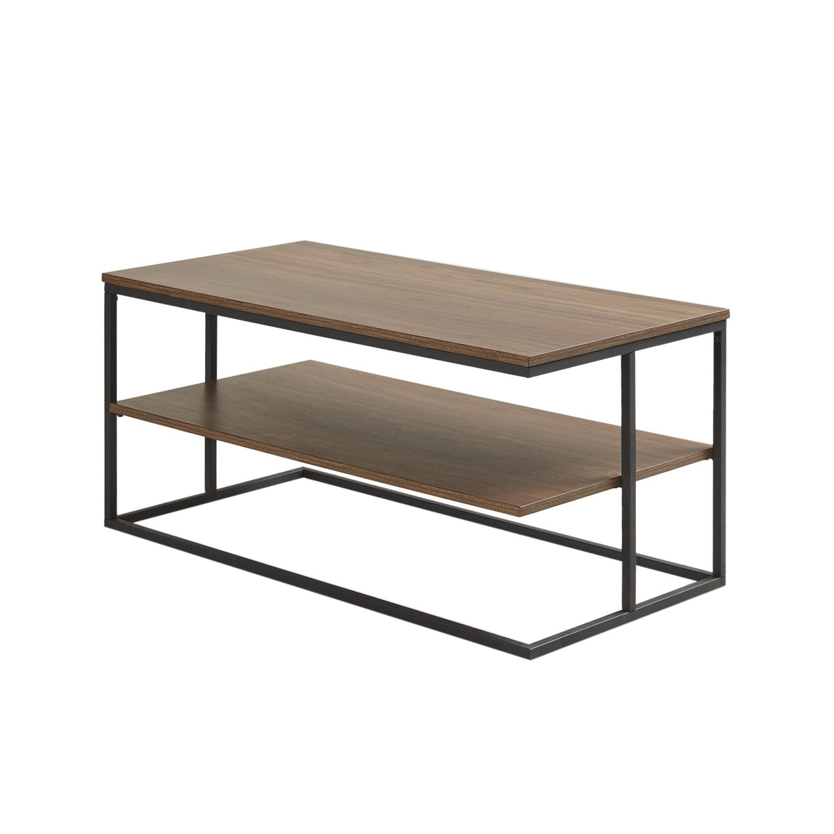 Complete your living room with the sleek style of the 510 DESIGN Monarch 42' 2 Tier Rectangle Metal Frame Coffee Table. This rectangular coffee table features open shelves with a dark coffee finish and a black metal frame, for a bold modern look. Plastic levelers on the bottom of the base provide increased stability on any type of flooring. Ideal for organizing your remotes, books, or tablets, this coffee table offers a stylish and multifunctional update to your living room decor. Simple assembly is required and tools are included.