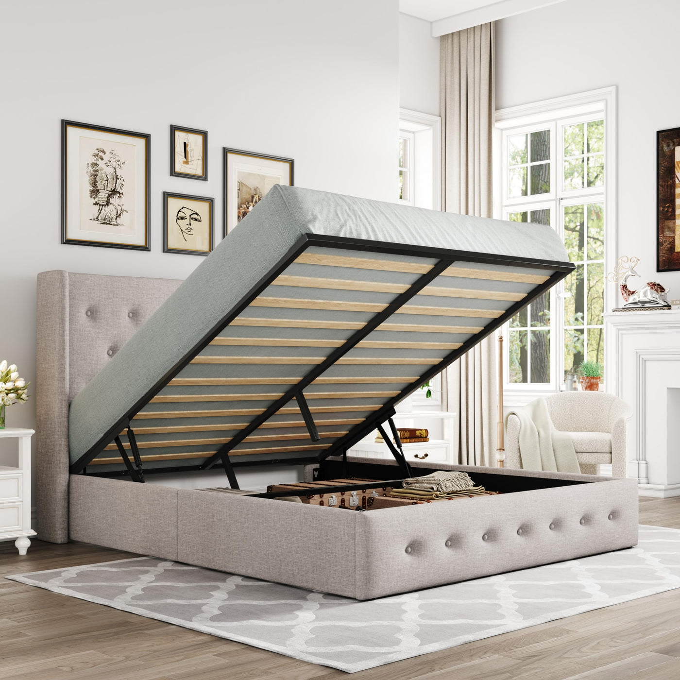 Allewie Queen Size Lift Up Storage Bed, Button Tufted Headboard With Wingback, Hydraulic Support, No Box Spring Needed, Light Beige