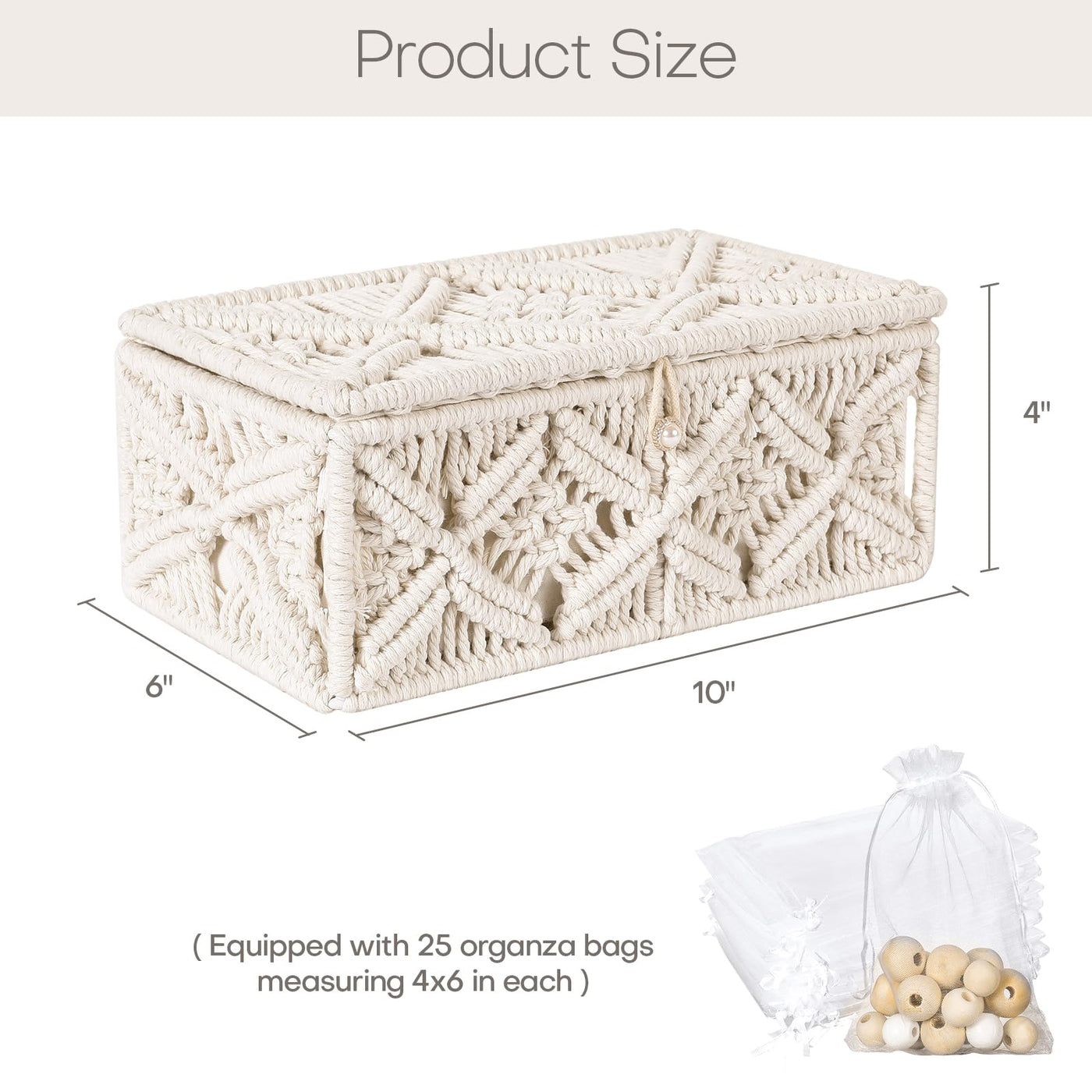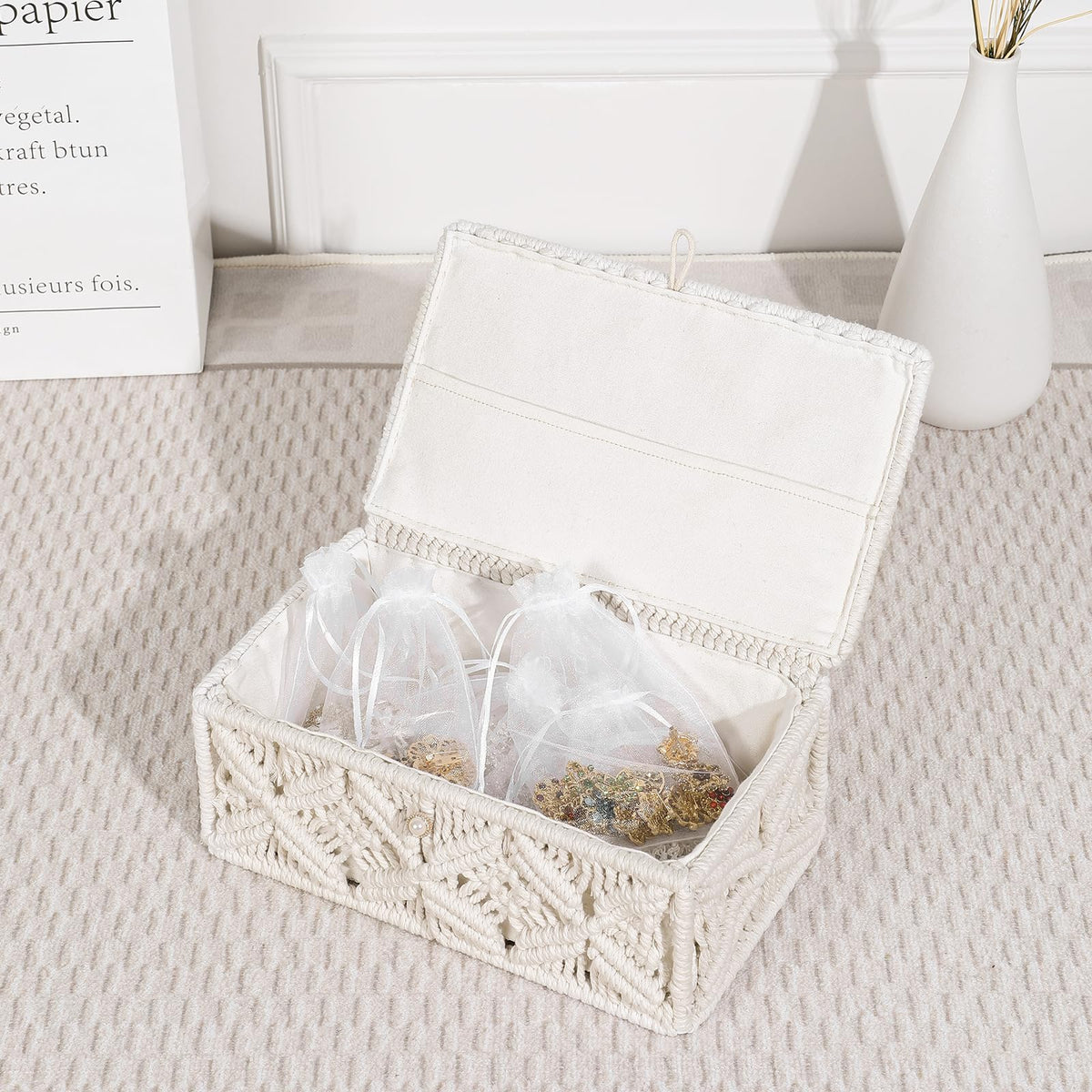 Anminy Macrame Storage Basket With Lid & 25Pcs Organza Gift Bags Bohemian Jewelry Box Handmade Woven Natural Cotton Rope Lidded